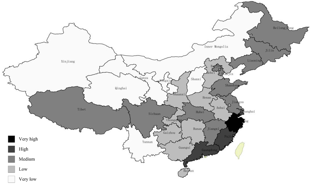 In the indicator system, x4-PM10 is the density of atmosphere particulate matter with diameter of 10 micrometers or less that is used to indicate the air quality of a city or a province in this study, the x6-Ratio of industrial solid waste utilized is the ratio between the industrial solid waste utilized and the industrial solid waste generated, the x7-Waste gas removal rate is the ratio between the removal waste gas and the industrial waste gas generated, the x8-Proportion of industrial waste water meeting discharge standards in total volume is the ratio between the volume of discharged waste water that meets the national standard of waste water ingredient and the volume of discharged waste water, the x11-Engel coefficient is the proportion of income spent on food.