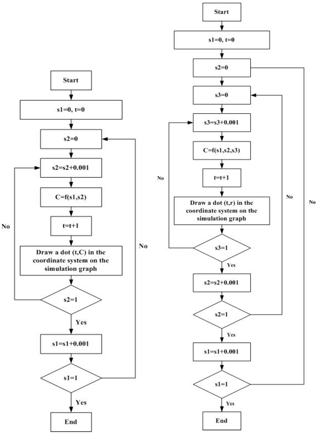 We set variables that represent the subsystems and the calculated result of the model, C—the coupling degree, and r—the coordination degree. The score of each subsystem starts from 0 and ends with 1. The program of simulation is set to traverse all combinations of the scores of different subsystems in repeated calculations of the degree of coupling and the coordination degree. After each calculation, there will be a dot in the coordinate system of the simulation graph. Finally, we get the distribution graph of the outcomes in a coordinate system for each model.