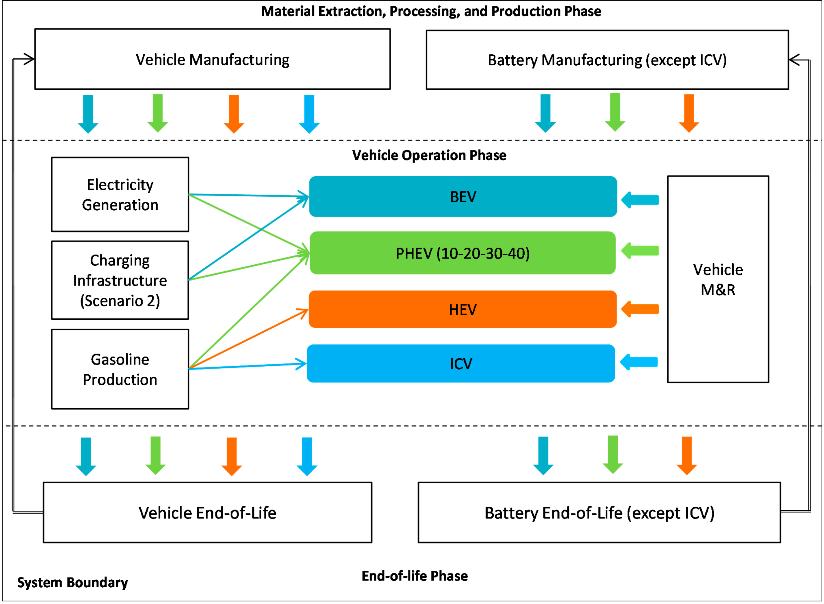 This analysis covers all life cycle phases from the material extraction, processing, manufacturing, and operation phases to the end-of-life phases of vehicles and batteries. The system boundary of the analysis is represented in Figure 1. The vehicle technologies are internal combustion vehicles (ICVs), HEVs and PHEVs with all-electric ranges (AER) of 10, 20, 30, and 40 miles of electric powered drive, and BEVs. AER is defined as the total miles can be driven in electric mode (engine-off) with an initially fully charged battery until the internal combustion engine turns on for the first time [52]. All of the battery types utilized in the alternative passenger vehicles are lithium ion (li-ion) batteries. The useful life time for these vehicles is assumed to be 150,000 miles and the functional unit is defined as 1 mile of vehicle travel. Each color in Figure 1 represent one vehicle type and the arrows indicate that there is a relationship between the associated vehicle and the corresponding process. For instance, electricity generation and construction of solar charging stations are the processes that are related to BEVs and PHEVs only. Similarly, the battery manufacturing and end-of-life of batteries are not calculated for the ICVs as they do not utilize li-ion batteries.