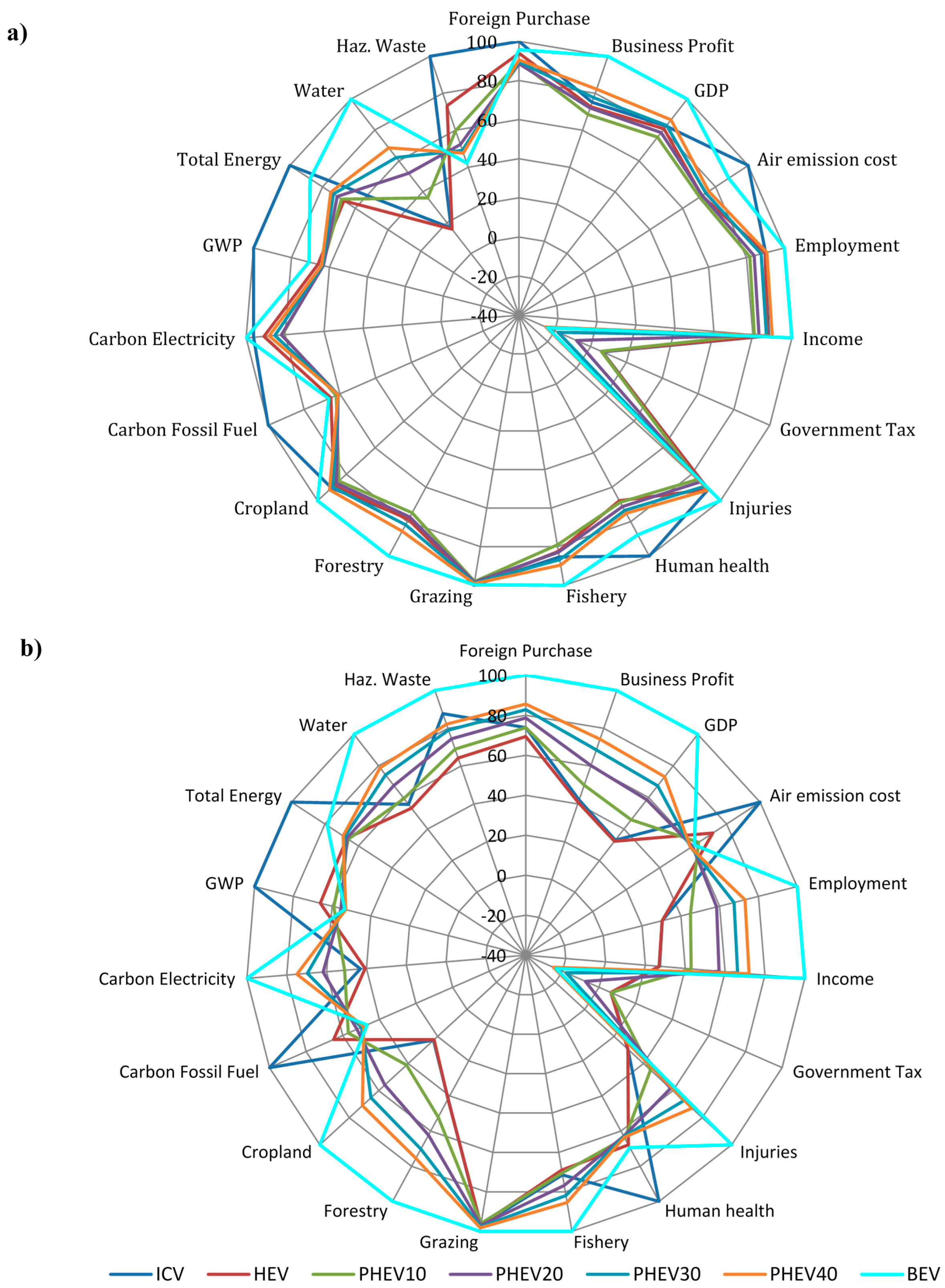Analysis of alternative vehicle systems needs a holistic triple bottom line sustainability accounting which requires a broad set of environmental, economic and environmental indicators [12]. Although many studies have used life-cycle based approaches to quantify the environmental consequences of alternative transportation systems, only a handful of studies have been found in the literature which analyze the socio-economic aspects of these transportation systems. The majority of the studies which conducted an environmental life-cycle assessment of conventional and electric vehicles mainly focused on the limited environmental impact categories such as greenhouse gas emissions, energy consumption, and some mid-point indicators [1,13,14]. In general, the difficulties related to precisely assessing the broader social and economic impacts of transportation stem from lack of appropriate methods, tools and data availability. However, the socio-economic effects of transportation should be considered since they are highly critical for the quality of people’s lives [15]. According to a comprehensive guidebook published by the Transportation Research Board on the socio-economic effects of transportation projects, travel time, safety, vehicle operating cost, noise, and congestion are listed among the prominent socio-economic metrics [16]. In another study related to issues in sustainable transportation, the importance of environmental, economic, and social indicators for sustainability assessment of transportation systems was discussed. According to Litman and Burwell [15], income, employment, accessibility, safety, equity, and affordability are listed as the major socio-economic metrics of sustainable transportation. Offer et al. [17] also conducted a comparative study and focused on the economic impacts of battery and electric vehicles using a life-cycle cost analysis based on capital cost, running cost, and end-of-life cost. Stone et al. [18] used the Global Trade Analysis Project (GTAP) database in order to analyze the socio-economic impacts of transportation projects considering a wide range of socio-economic indicators such as contribution to gross domestic product (GDP), household income, poverty, and import. The World Bank’s report on social analysis of transportation projects also revealed important insights regarding the significance of socio-economic aspects of transportation. In this report, employment, road safety, health impacts, and accessibility are considered key drivers of socio-economic sustainability in transportation [19]. In a report published by the European Commission for the future of sustainable transportation in European States, number of fatalities and injuries, contribution to GDP, employment, external cost of transportation activities such as congestion, emission and safety, taxation, average passenger travel time, and affordability are listed among the key indicators to assess the socio-economic sustainability aspects of transportation activities [20]. As can be seen from the aforementioned review studies and government reports, the selection of socio-economic indicators show differences between the studies; however, economic cost of emissions, income and employment generation, tax, human health impacts, contribution to GDP and foreign trade can be seen as commonly used quantitative indicators that are addressed in this research. Other indicators such as accessibility, affordability, equity, travel time, congestion and noise are excluded from the scope of this paper due to lack of appropriate data for new electric vehicle technologies, irrelevance to the aim of this paper, and difficulties in integration with a proposed input-output based life cycle approach.