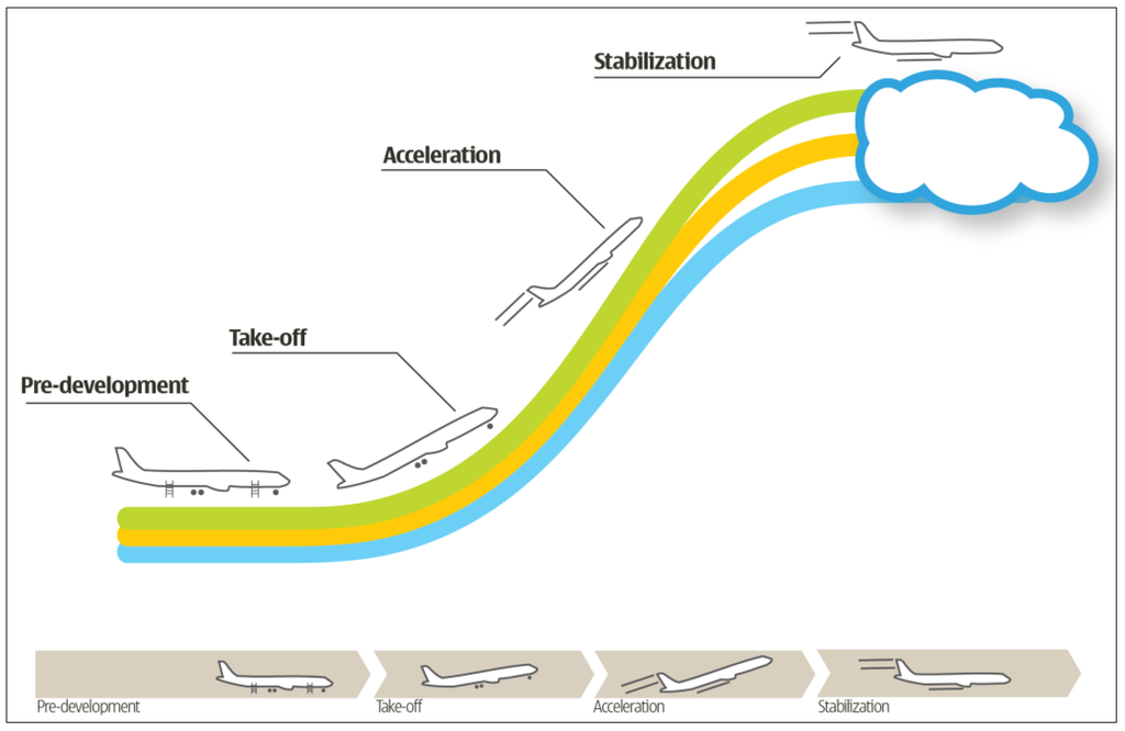 - Take-off: The take-off is the phase during which the regime in place starts to absorb the transition impulses and shows a visible—be it cautious—start of a change process. It is the phase during which a number of reactions to the unsustainable situation get higher visibility, are mutually connected and reinforce each other.