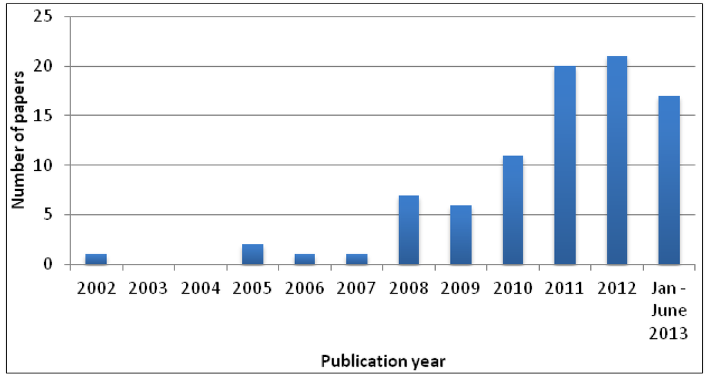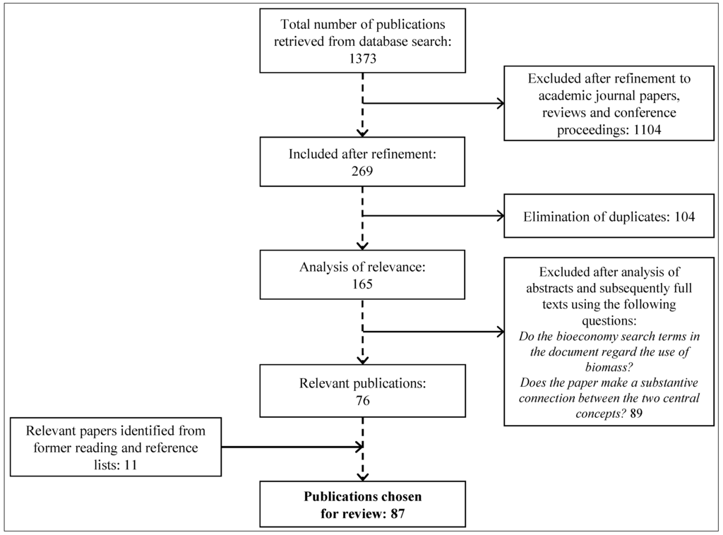Since databases do not cover all publications, it was decided to include additional literature, provided that it fulfilled the screening criteria. These papers were selected from previously identified literature and from screening the reference lists of the publications found in the database search. This resulted in an additional 11 papers. In total, 87 publications were selected for review. While these publications are assumed to represent a significant proportion of the relevant literature on the concepts of bioeconomy and sustainability, it is still possible that some work has not been identified. Nevertheless, we are confident that these publications provide a rather complete coverage of scientific contributions to the debate.
