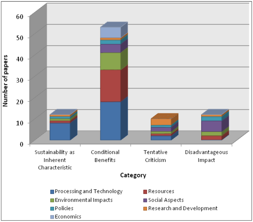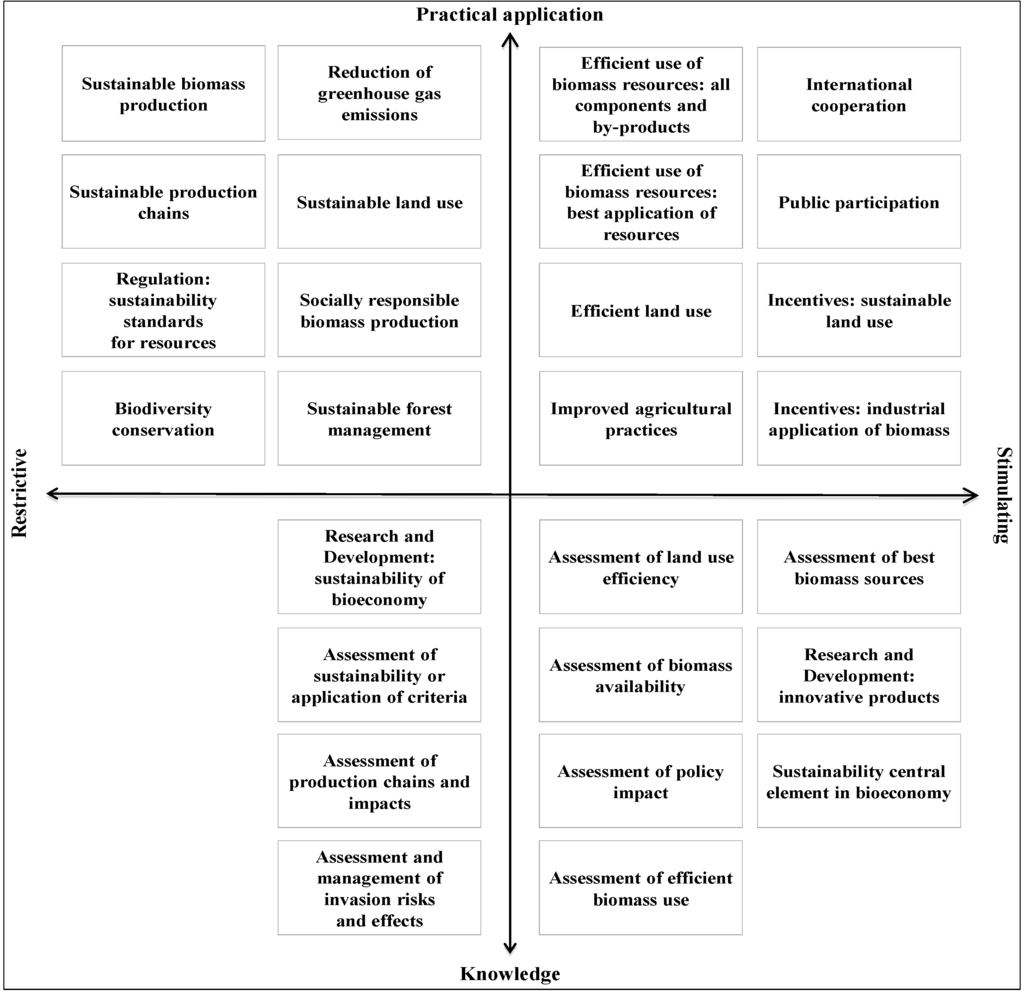 For the reviewing process regarding our main research question, the qualitative data analysis (QDA) software package, ATLAS.ti (version 7, [18]), has been used to enable a systematic and consistent approach of analyzing the publications. This approach proved to be useful to identify the various topics and visions related to our research question. The analysis was conducted inductively, marking relevant text passages with codes. In a later stage, the codes were combined into categories according to similar visions on the research topic. The categories and their characteristics are presented in Section 3.2. Furthermore, the codes provided an overview of all issues regarding the sustainability of the bioeconomy addressed in the reviewed publications. The results are presented in Section 3.2 and Section 3.3.