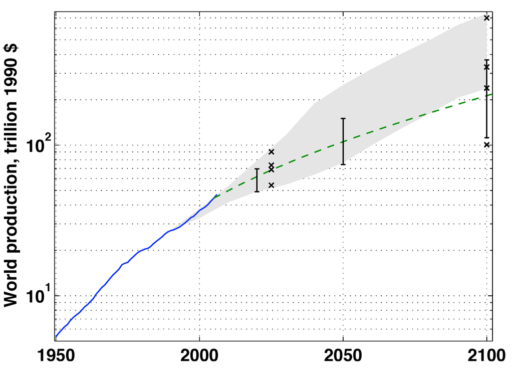 Scenarios of future growth in world production. Shown are historic production growth for 1950–2006 (solid line), the range of projected production (fifth to 95th percentile) for 2050 and 2100 among the scenarios collected in the Intergovernmental Panel for Climate Change (IPCC) database (error bars), production in the four distinct 1992 IPCC economic scenarios for 2025 and 2100 (x markers), the range of production in Special Report on Emissions Scenarios (SRES) scenarios for 1990–2100 (gray shading) and the growth trajectory of the DICE-2007 integrated assessment model with default parameter values (dashed line). The vertical scale is logarithmic, so that a constant growth rate would plot as a straight line.
