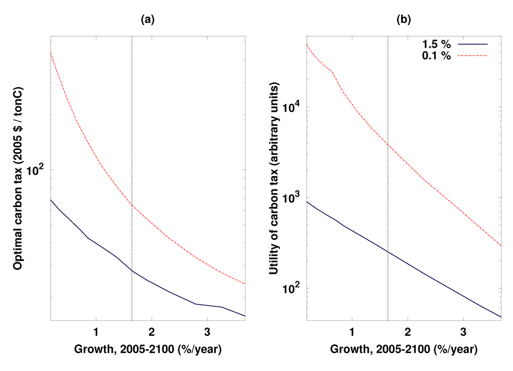 The impact of economic growth assumptions on optimal emission trajectories in DICE is sensitive to several other parameters in the model, including the pure rate of time preference and the dependence of utility on income. The assumed 1.5%/year pure rate of time preference effectively attenuates the relevance of future generations’ suffering for present decisions [49]. If we now change the assumed pure rate of time preference to 0.1%/year, matching that used in Stern [7] and granting much more importance to the utility losses of future generations, the increase in the present optimum carbon tax rate with decreasing assumed future economic growth is sharper. The tax rate approximately doubles from its default (which at $65/tonC, is already more than double the $28/tonC optimum under a 1.5%/year rate of time preference) if assumed economic growth drops to 1.0%/year and quadruples for growth of 0.5%/year (Figure 2a).