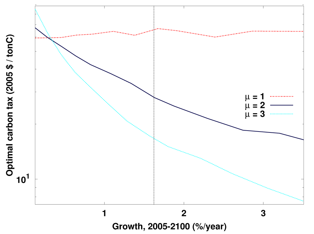 Optimal present-day (2000-2010) carbon tax (2005 $ per ton C) as a function of assumed economic growth rate under different assumed values of µ, the elasticity for the utility of consumption, and a discount rate (pure time preference) of 1.5%/year. The vertical dashed line indicates the growth rate under the default model assumptions (about 1.6%/year). The vertical axis is logarithmically scaled. The results shown in Figure 2 use µ = 2, the default value in the DICE model.