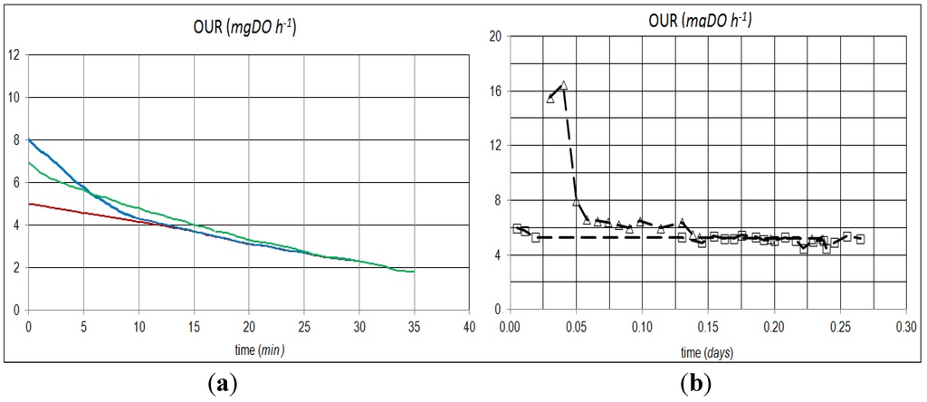 In the absence of an exogenous substrate, the trend of the respirogram represents a decay that can be described by a decreasing exponential function. Under these conditions, substrate addition causes an immediate increase in the oxygen consumption rate, which returns to values corresponding to endogenous conditions only when the feed (substrate) has been completely removed (Figure 1b).