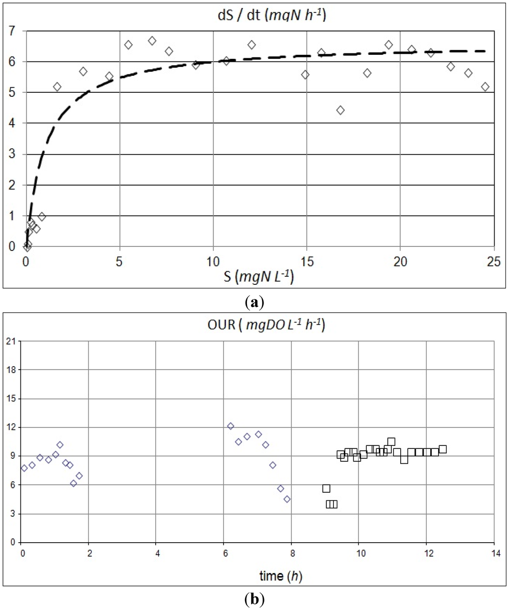 Autotrophic biomass tests: (a) comparison of the data by the Michaelis–Menten theory; (b) respirogram obtained with the addition of ammonium chloride (small rhombs) and sodium nitrite (squares) in the same sample.