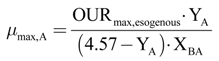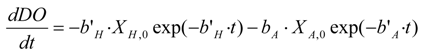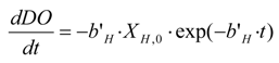 The parameter, bH, is connected with b’H , introduced to describe all the processes responsible for energy consumption and biomass reduction and not associated with cellular growth (decay, lysis, etc.) [22]. The cellular decay rate, b’H, is represented by the slope of the line that interpolates the experimental points plotted on a semi-logarithmic graph of OURmax,ex [12].
