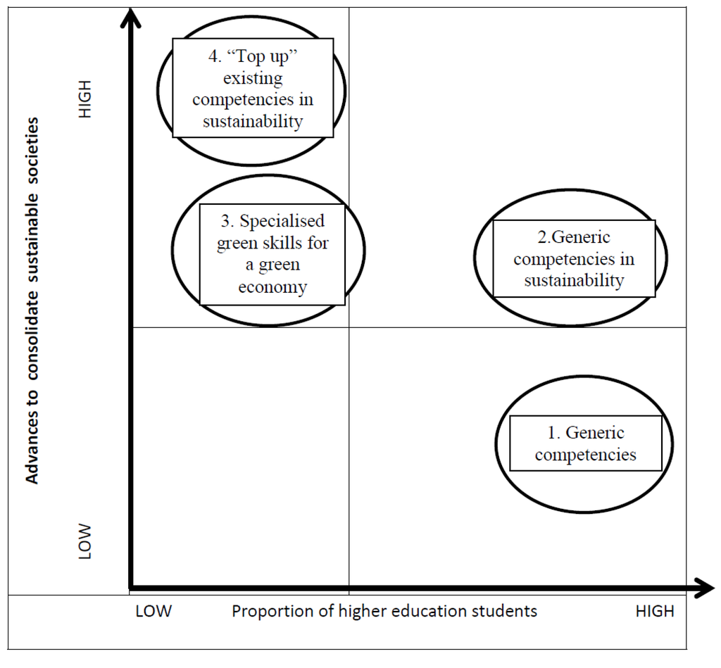 The above interpretation can be made because, on the one hand, the transition towards a sustainable economy anticipates an increase in jobs in the green economy sector; for instance, those jobs related to waste collection and recycling, renewable energies, or the management of natural spaces demand professionals who are equipped with specialized competencies to perform such tasks. On the other hand, this transition will imply that professionals currently holding traditional jobs will need to update themselves to acquire the new competencies necessary in the context of sustainable development. It should also not be overlooked that the overall population—potential recipients of green products and production processes—likewise need to possess competencies in sustainability to be able to value the advantages offered by the new economic model. The latter competencies, indispensable for any citizen belonging to a sustainable society, could be even more relevant than those more specialized technical competencies (green skills) distinctive of a particular productive sector, because, by leading to changes in mentality, they modify the social patterns and lifestyles, hence favoring the change in the production-consumption economic model and providing the necessary conditions for the development of the green economy.