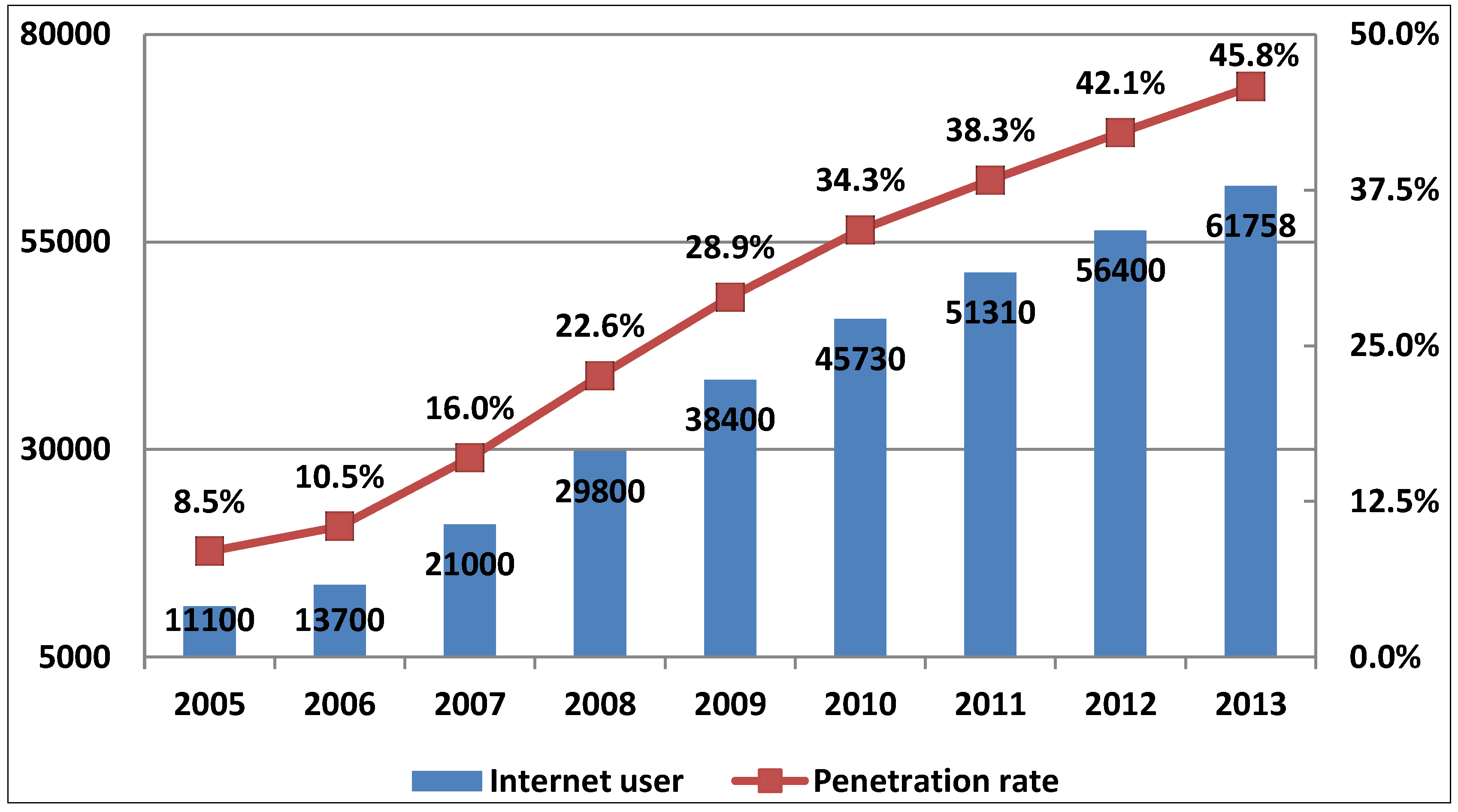 Since the Chinese market is huge, diverse and rapidly evolving, with a unique cultural background, global e-business companies such as eBay and Amazon.com should change their strategies to adapt or localize Chinese Guanxi for successful operation in the global Chinese market. Figure 1 shows that the number of Internet users in China rapidly increased to 45.8 % in the year 2013. Moreover, internet shopping mall users represent 48.9 % (or 0.3 billion) of all internet users [1]. If overseas users and buyers are included, the statistics are even greater.