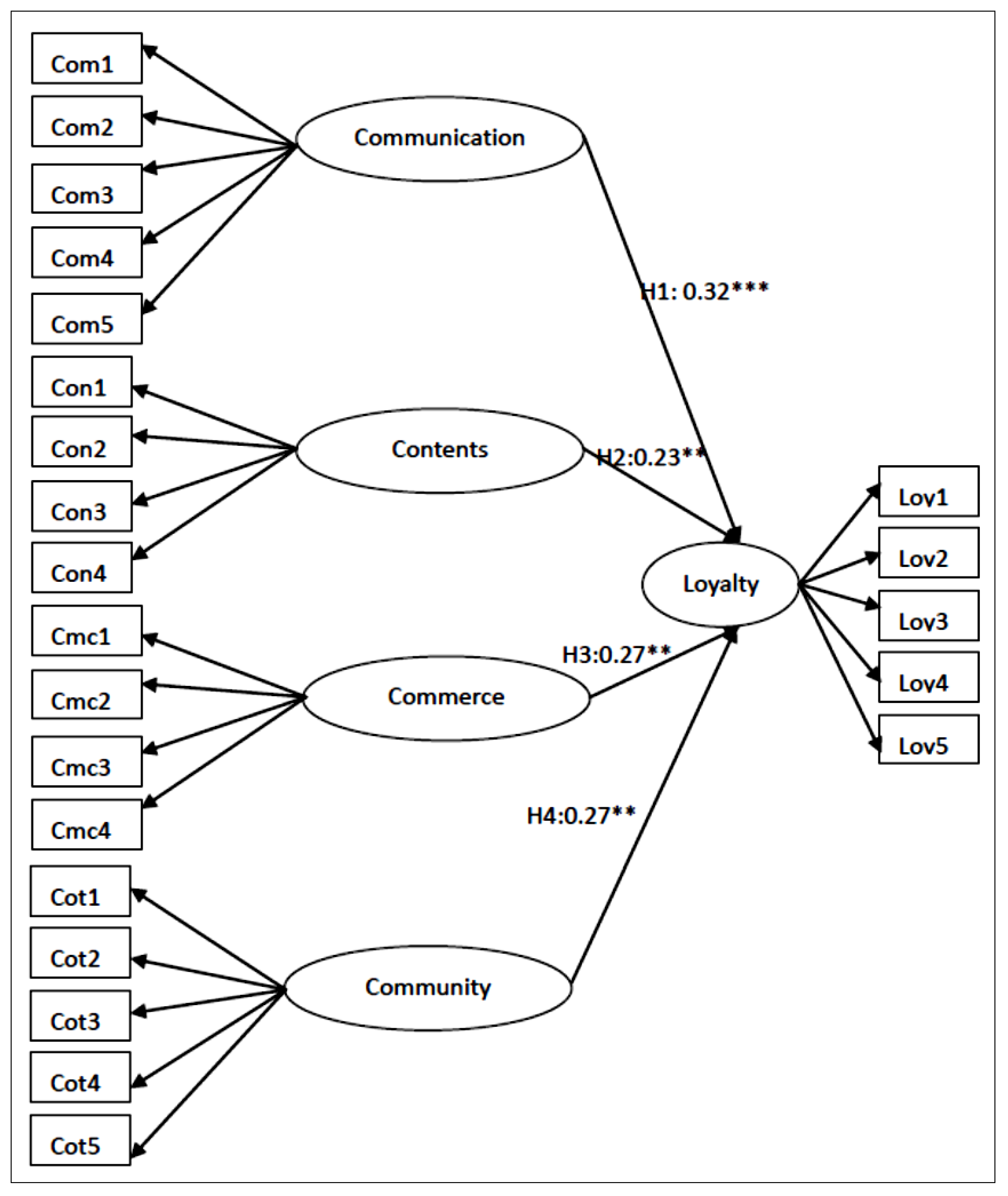 Based on these tests, we now test the proposed hypotheses. By using the SEM, we find that the ML estimation method fits our data most appropriately; therefore, ML estimation is used for the hypotheses testing. The empirical findings are presented in Figure 4. Our results show that all the web marketing strategies have a positive impact on customer loyalty. Therefore, H1 to H4 are supported (p < 0.005). Among the web marketing mix strategies, communication is the most influential concerning customer loyalty, whereas the content contribution is the least influential.