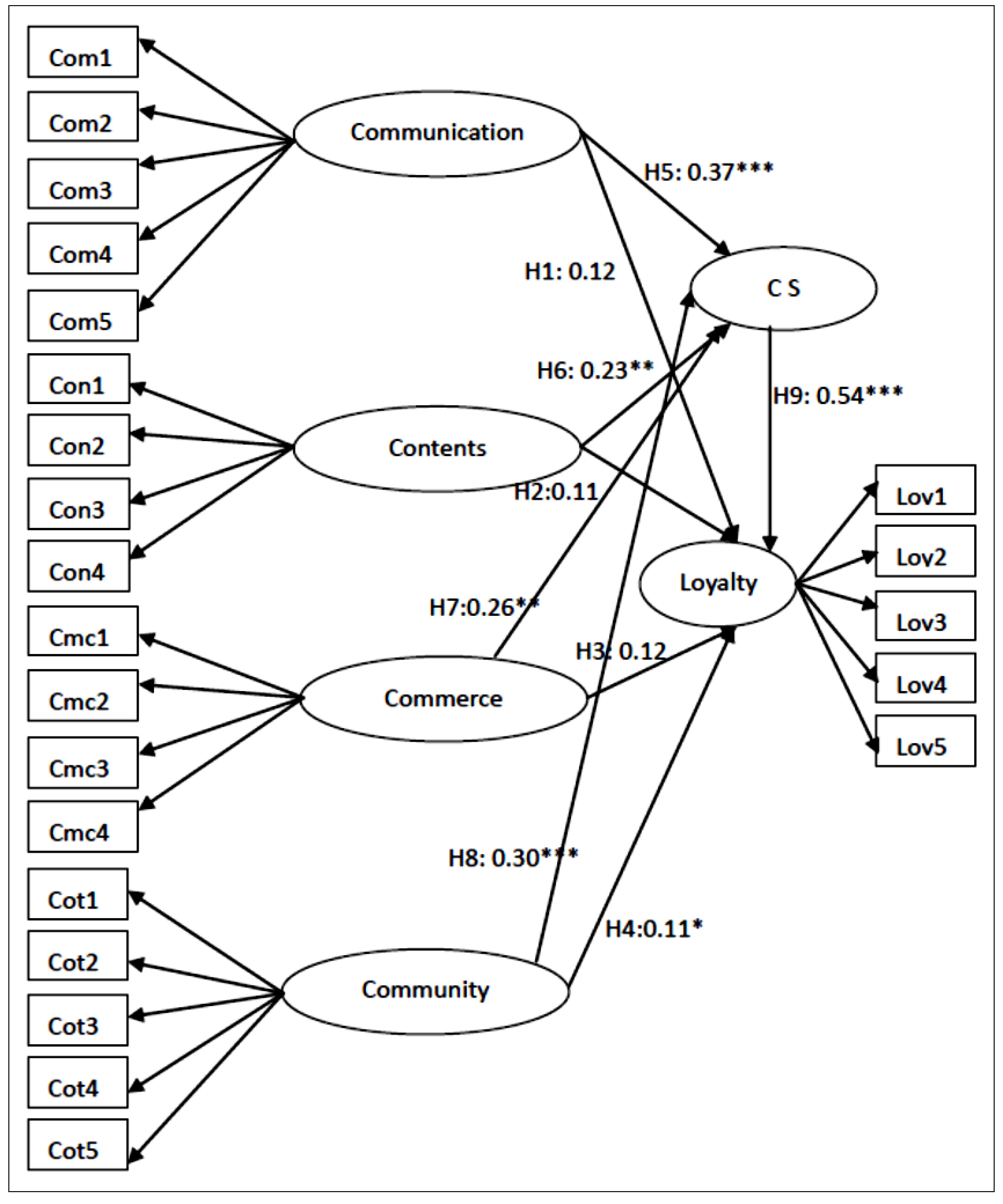 Compared with the direct model in Figure 4, the results of the mediation model in Figure 5 show that the mediatory hypotheses H5, H6, H7, and H8 support condition (1); hypotheses H1, H2, H3, and H4 support condition (2), and H9 supports condition (3). With respect to the mediator condition (4) concerning consumer satisfaction, communication, contents, and commerce have no effect on consumer satisfaction, whereas the effect of community has a lower but marginally significant effect (p > 0.01). Therefore, we conclude that the relationship between communication, content, and commerce strategies are fully mediated by customer satisfaction, whereas the community strategy of the web marketing mix is partially mediated by customer satisfaction concerning loyalty.