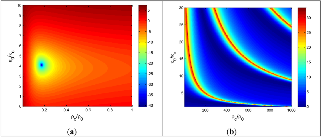 Scattering cross-section (SCS) variation (dB) obtained by varying the density and bulk modulus of the coating. The plasmonic scattering region is shown in (a) and resonant/antiresonant regions are displayed in (b).