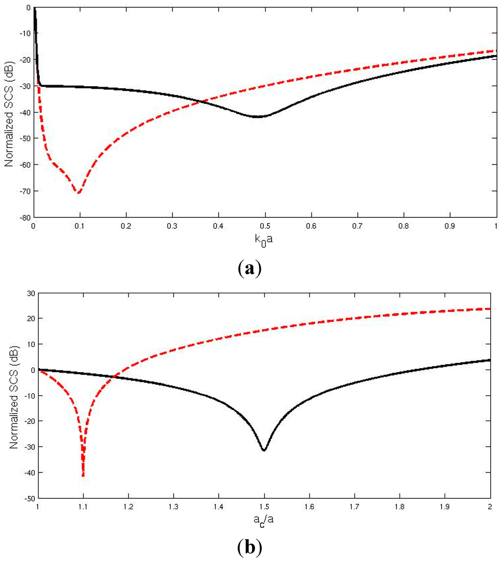 Further indications on the effectiveness of the SCS reduction can be obtained by reporting its values as a function of the normalized frequency k0a or of the cover radius ac. The first analysis (reported in Figure 4a) allows appreciating the frequency bandwidth over which it is possible to keep the SCS reduction below a desired level, showing that a satisfactory performance can be obtained in an extended frequency range.