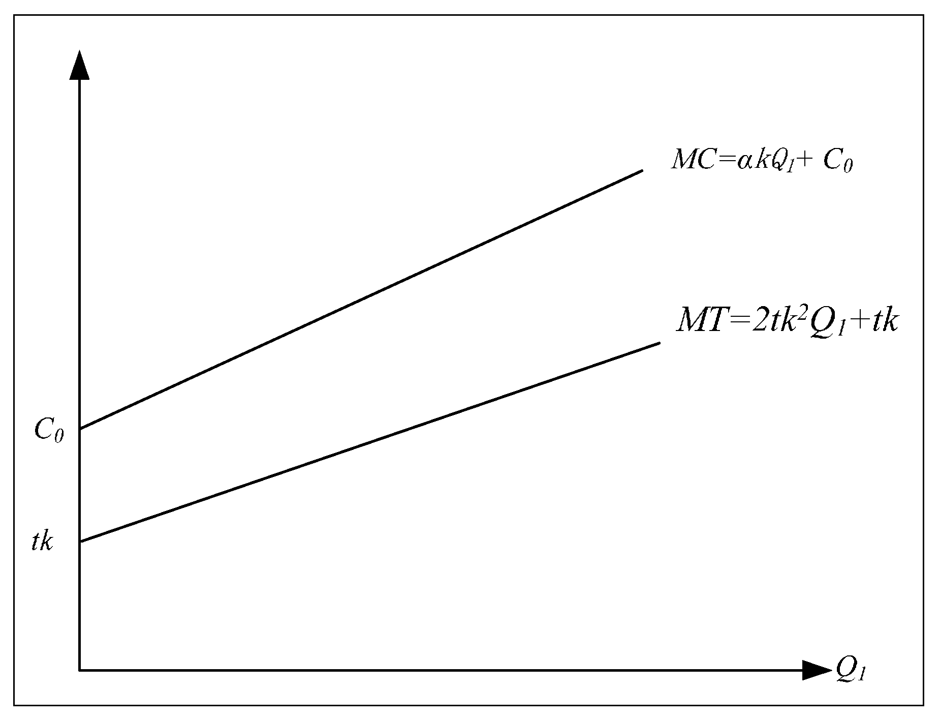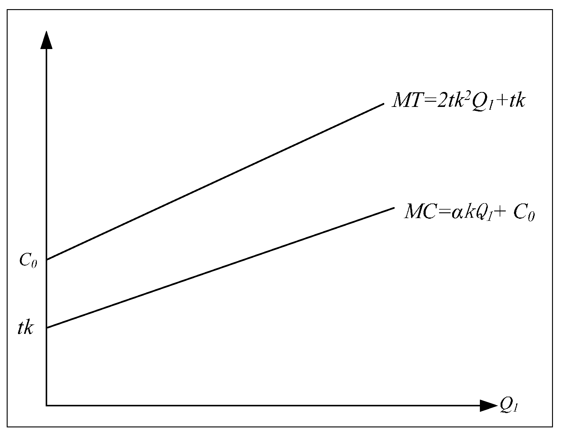 - The initial pollution treatment cost of the environmental protection industry as C0. When C0 > tk, and the slope of MC is larger than that of MT, namely αk > 2tk2, then t < min(
