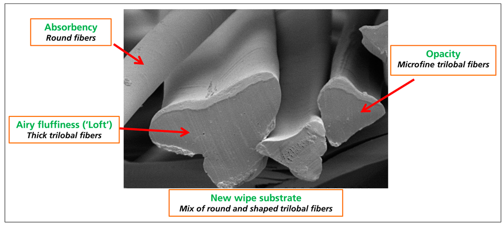 The multi-size trilobal fibers increase the surface area of the substrate by more than 40% and opacity, which positively impacts the user’s trust in the product. This increased surface area allowed the wipe size to be reduced by approximately 7%, and to reduce overall material usage across the brand, while maintaining a soft and absorbent experience for cleaning babies’ skin.