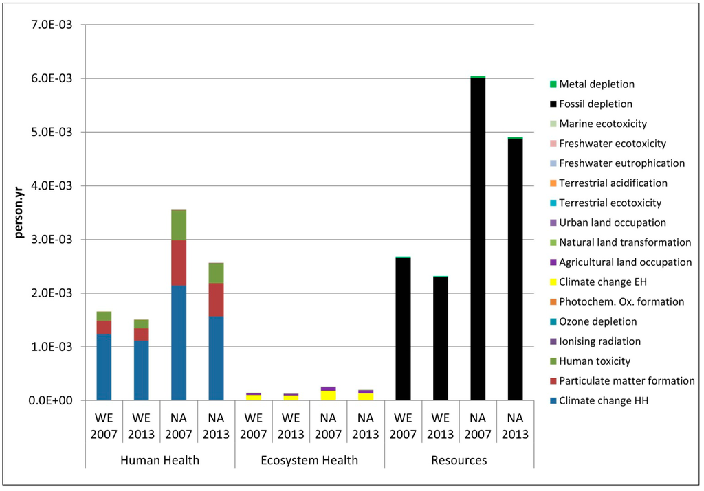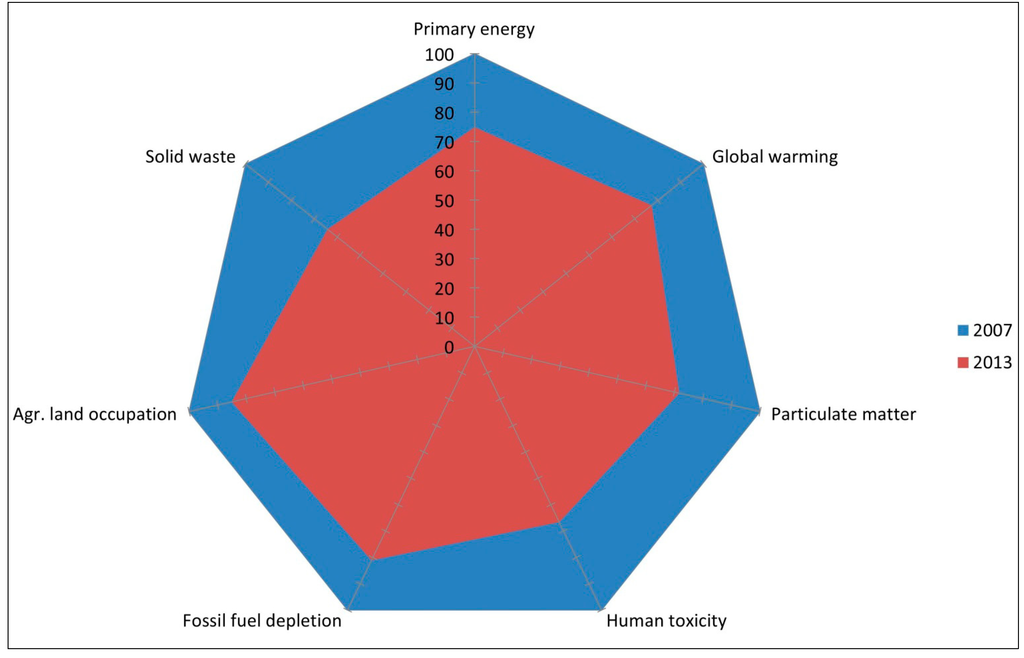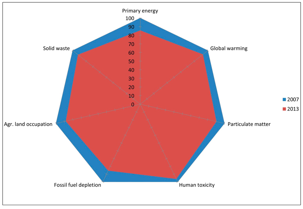 LCA results for 2013 are considered significantly different when they are 10% above or below the reference value for the 2007 product system.