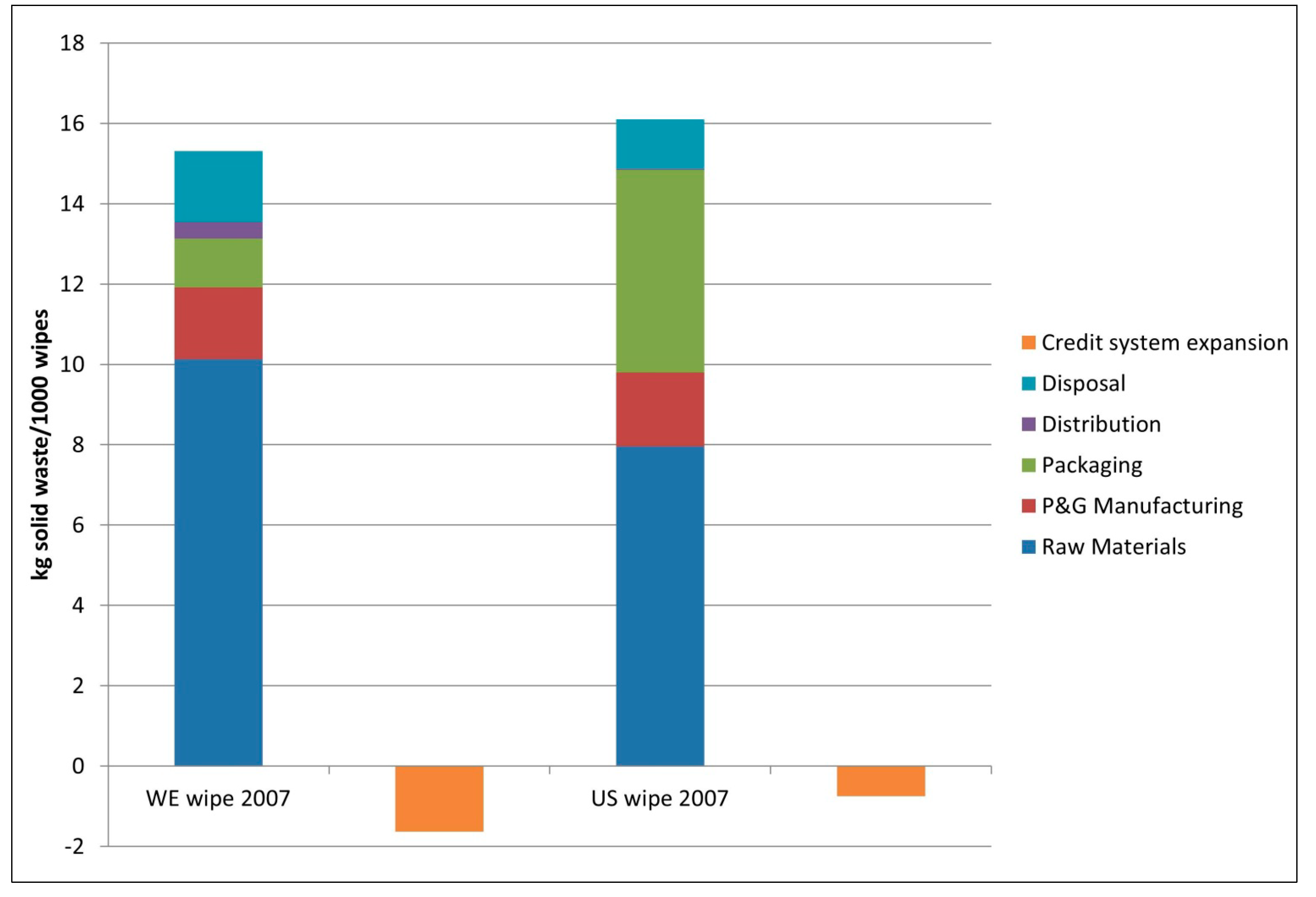 The standard methodology follows the ISO 14040/44 Guidelines for LCA, and incorporates commercially available inventory data from Ecoinvent as well as other data from P&G and its suppliers. Results are reported for the impact indicators with high relevance for the product category: dry weight, primary energy, global warming, particulates, agricultural land occupation (forestry), fossil fuel depletion, and solid waste generation. Generally, raw material supply chains for the product and packaging contribute most (up to 82%) to the calculated environmental impact indicators. The relevant environmental indicators of the 2013 baby wipe have 4%–14% and 15%–36% smaller values than the 2007 version for WE and the U.S. respectively. Overall, improvements are larger for the U.S., driven by higher dry wipe weight reduction and packaging weight reduction.