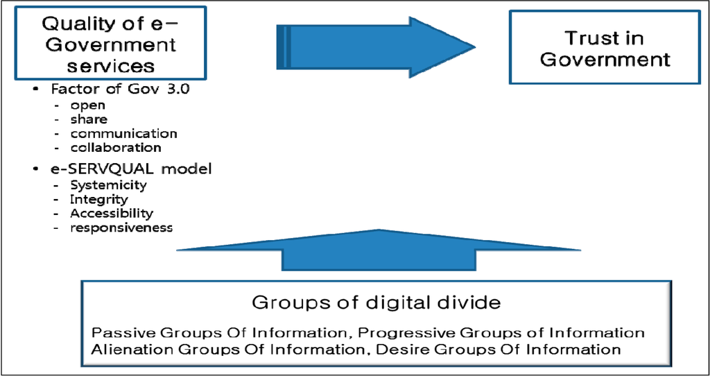 In this study, we utilize the e-SERVQUAL model, which is used for assessing quality of e-service. Kim [41] used e-SERVQUAL model to evaluate quality of e-Government services. Parasuraman et al. [42] developed SERVQUAL, which consist of five dimensions such as reliability, responsiveness, assurance, empathy and tangibles to measure quality of service. Kim [41] suggests e-SERVQUAL including systemicity, integrity, accessibility, and responsiveness by exploiting SERVQUASL. Additionally, we added the factors of Gov 3.0 which are slogan by Gun Hae Park administration: openness, sharing, communication, and collaboration, because e-SERVUAL cannot sufficiently reflect trend of the smart society which is pervaded by mobile environment. This means that Gov 3.0 is different from previous e-Government services. Gov 3.0 emphasizes the role of private sector and government is not unilateral service provider but supporter for private sector in Gov 3.0. In addition, Gov 3.0 is interested in value creation by private sector. According to this paradigm shift, we apply factors of Gov 3.0 to the measurement on e-Government services. By utilizing the research model, we suggest a research model which assumes the relationship between quality of e-Government service and trust in government.
