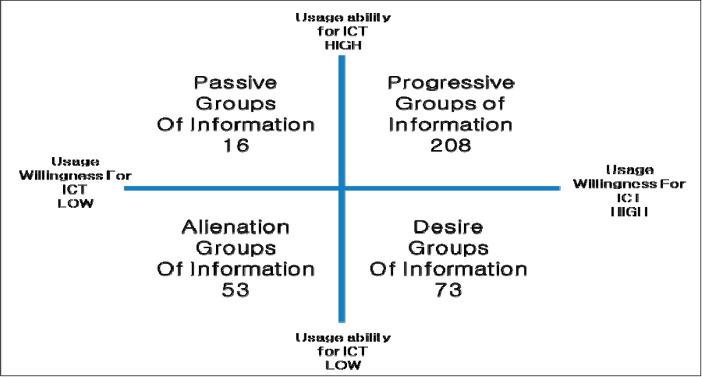 The model in Figure 2 was used to classify groups of the digital divide and examine how the level of trust would vary across the groups. As classified in Seo [33], the digital divide is categorized as “passive”, “progressive”, “alienation”, and “desire” groups based on the ability and willingness to use ICT. As Park and Kwon [32] suggested, an individual’s personal ability to use ICTs has now understood as a key variable, attracting academic interests on a possible correlation between an individual’s intentions and behavior of ICT use. Even if individual users lack sufficient ability to use ICT, their willingness to use ICTs may influences traditional factors, which determined the pattern of the digital divide. Seo [33] examines individuals’ ICTs understanding and willingness and finds that individuals with similar intentions tend to belong to similar information groups.