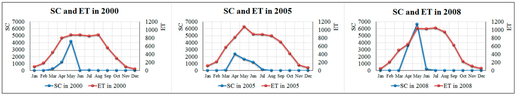 The monthly soil conservation amount (SC) (Unit: thousand ton) and ET (Unit: mm) in 2000, 2005 and 2008.