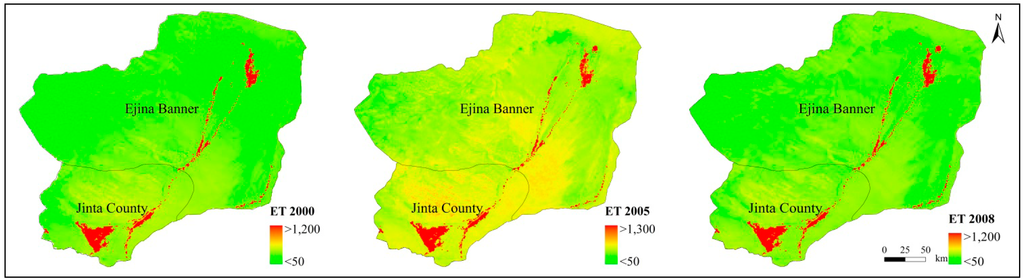 Spatial pattern of the annual ET in 2000, 2005 and 2008.