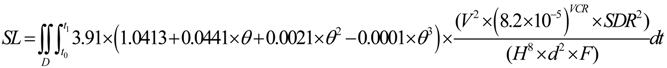 where SL is the amount of soil loss (Unit: t), including SLp under the condition that there is no vegetation coverage, and SLa under the condition that there is vegetation coverage in the study area; V is the wind velocity (Unit: m/s), H is the relative air humidity (Unit: %), SDR refers to the artificial surface destruction rate (Unit: %), which is the share of the artificially destructed land area in the total land area, d is the average soil particle radius (Unit: mm), F is the soil hardness, θ is the slope (Unit: °), D refers to the spatial extent of the study area (Unit: km), and t is the time (Unit: s). VCR is the vegetation coverage rate, which is calculated as follows.