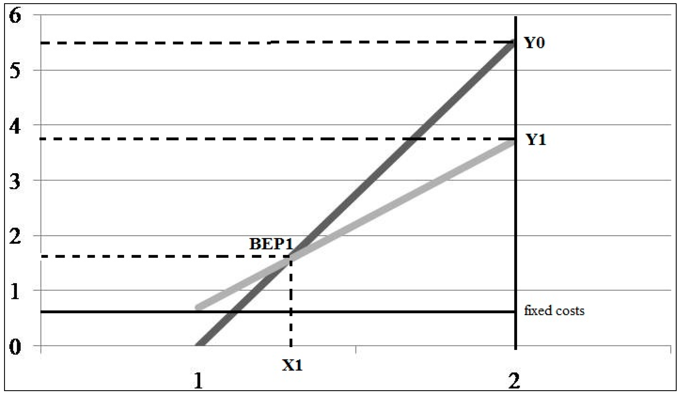 LLC “Urozhaynoe” resulted in 2012 with revenue of 5.5 mln Euro (Y0), expenses of 3.7 mln Euro (Y1) (including fixed costs of 0.7 mln Euro). Thus, the profit (Y0–Y1) was 1.8 mln Euro. BEP1 is a breakeven point of LLC “Urozhaynoe” at the current method of rental payments calculation.
