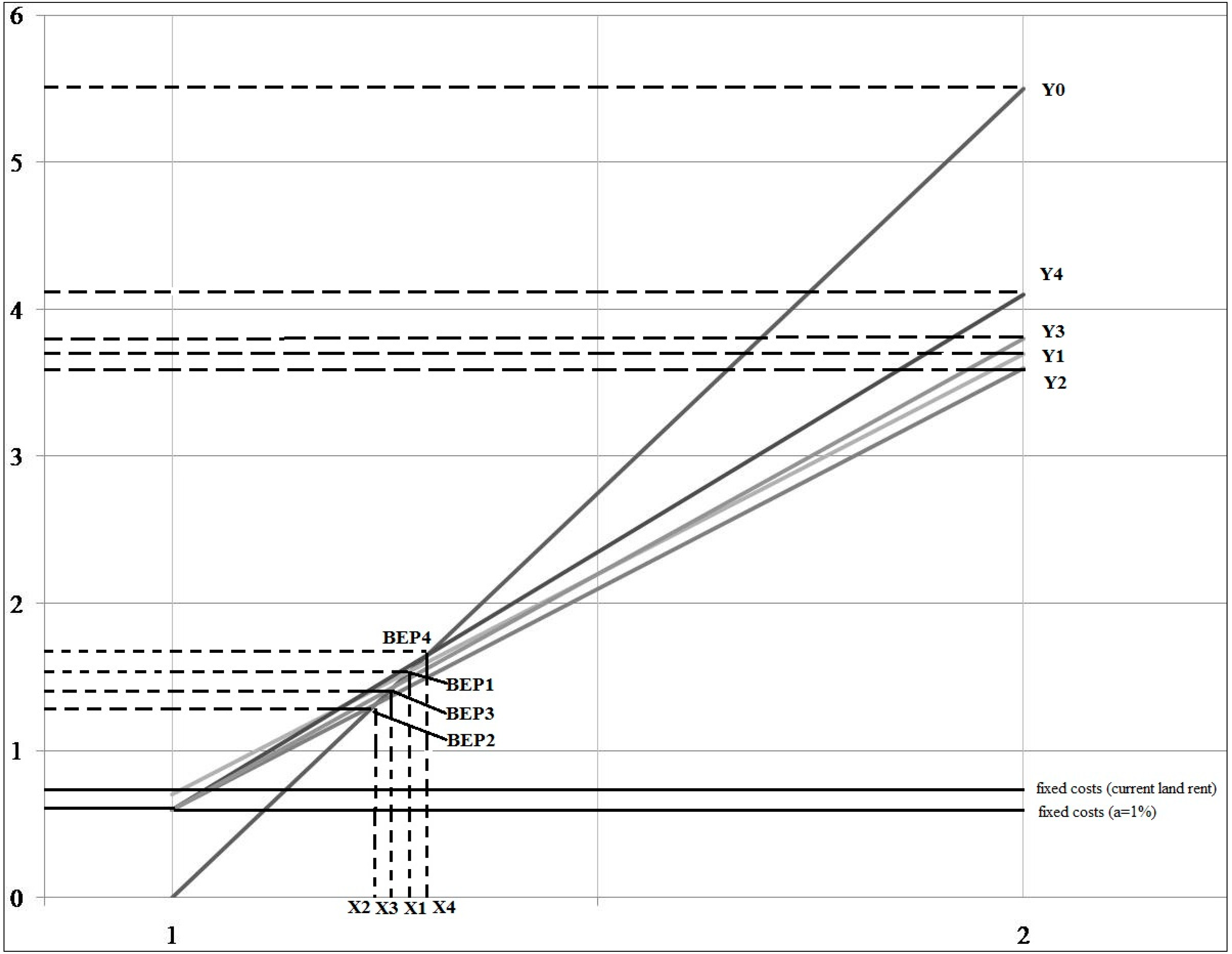 In the situation, when a = 10%, breakeven point BEP3 approaches the current level of BEP1, however, does not overpass it. Land payment rates over 10% move BEP up the Y-axis and right the X-axis, until it increases the existing level of BEP1. In contrast, land payment rates below 10% move BEP down the Y-axis and left the X-axis, substantially below the existing breakeven level.