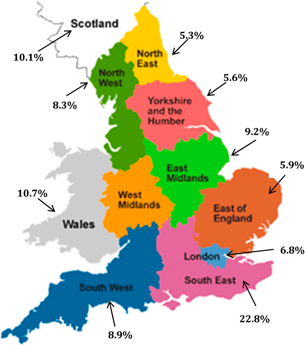 In order to identify if the respondents’ particular location of housing industry within the UK had any influence on the rankings of criteria importance given, the Kruskal-Wallis test was conducted. Respondents were assigned to one of the 11 UK regions (UK regions and response rate from each region are shown in Figure 3). Results revealed that there was a statistically significant difference between the UK regions for the following criteria: