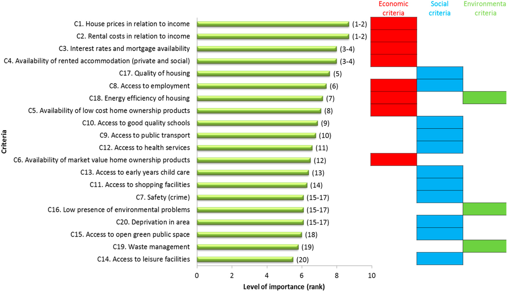 In terms of the overall rank order of the criteria, the results reveal that the housing stakeholders perceived “house prices in relation to income” (C1) and “rental costs in relation to income” (C2) to be the most important criteria, ranking equally as 1st and 2nd. This was expected given that housing affordability is habitually defined by the ratio approach [1,17]. Criteria “Interest rates and mortgage availability” (C3) along with “availability of rented accommodation (private and social)” (C4) were ranked equally as 3rd and 4th. It is not at all surprising that these four economic-related criteria were rated highest overall considering that affordability is habitually defined and assessed by financial attributes) [1,16,17]. Interestingly, the “availability of rented accommodation” (C4) was rated at very high level of importance. This could reflect the growth of the rented sector in the UK, especially for the younger generation who have found it difficult to access owner-occupation since the recession [70]. In comparison to this, other economic criteria such as “access to employment” (C8), “availability of low cost home ownership products” (C5) and “availability of market value home ownership products” (C6) were ranked as 6th, 8th, 12th, respectively. The higher importance placed on a choice of affordable tenure options was also raised by, for example, Pittini [71] who stresses that the affordability problem can be exasperated if there is a lack of tenure choice and this can also impact on the stability of housing markets and therefore of the whole economy. Access to employment has received a high rank order in comparison to access to other amenities and facilities which supports views shared by other authors [18,37,42], who stress the importance of housing that has good accessibility to jobs, especially since this will have a direct impact on household income. “Quality of housing” (C17) was ranked as the 5th most important criterion to sustainable housing affordability, confirming the importance of having, not only low-cost housing, but also decent standard housing. This is in conformity with researchers who advocate the importance of considering housing condition and quality in relation to affordability [30,35,36,37,40,41]. A number of researchers, such as [18,35,36,37] stressed the need to consider location related attributes such as local amenities and facilities in relation to housing affordability. Criteria representing access to key services and facilities (represented by C9, C10, C11, C12, C13, C14 and C15) were perceived to be of middle or low importance to sustainable housing affordability by the respondents in this study. While such criteria were not perceived to be as important as economic factors and housing quality, the findings do show that they are considered to be important to some extent by the professional respondents, particularly access to schools and public transport which coincides with research undertaken by [18,42,48,72]. The environmental and economic criterion “energy efficiency of housing” (C18) was rated fairly high in 7th position, indicating the significance of providing affordable housing that is also sustainable by design. This supports the views of other authors [43,60,69] who highlight the importance of energy efficient housing, especially given the increase in expenditure on domestic energy consumption and the widespread phenomenon of energy poverty in the EU [71]. “Safety” (C7), “presence of environmental problems” (C16) and “deprivation in area” (C20) were ranked as 15th, 16th and 17th. “Access to leisure facilities” (C14) was rated as the least important criterion overall, with “Availability of waste management facilities” (C19) scoring only slightly higher. Perhaps the translation and acceptance of the importance of such criteria to affordability, which are more “qualitative”, will be slower in industry/policy environments than for the academic environment. In some respects this confirms Stone’s [20] view that academic and policy environments may be inconsistent with the notion of affordability.