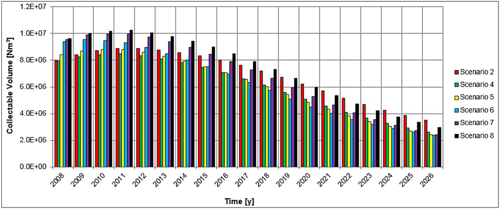 Figure 2 presents the maximal volume of collectable biogas during the operating period of the generator. However, such calculation is affected by the variability of the results. It is possible to highlight that, for five of the six scenarios, the most convenient year for starting the biogas exploitation is 2011, whilst, for the remaining scenario (Scenario 6), the maximum collectable volume would have been obtained if the biogas exploitation had started in 2009. Therefore, these results suggest that the biogas utilization should start as soon as possible, in order to exploit the maximal available energy.