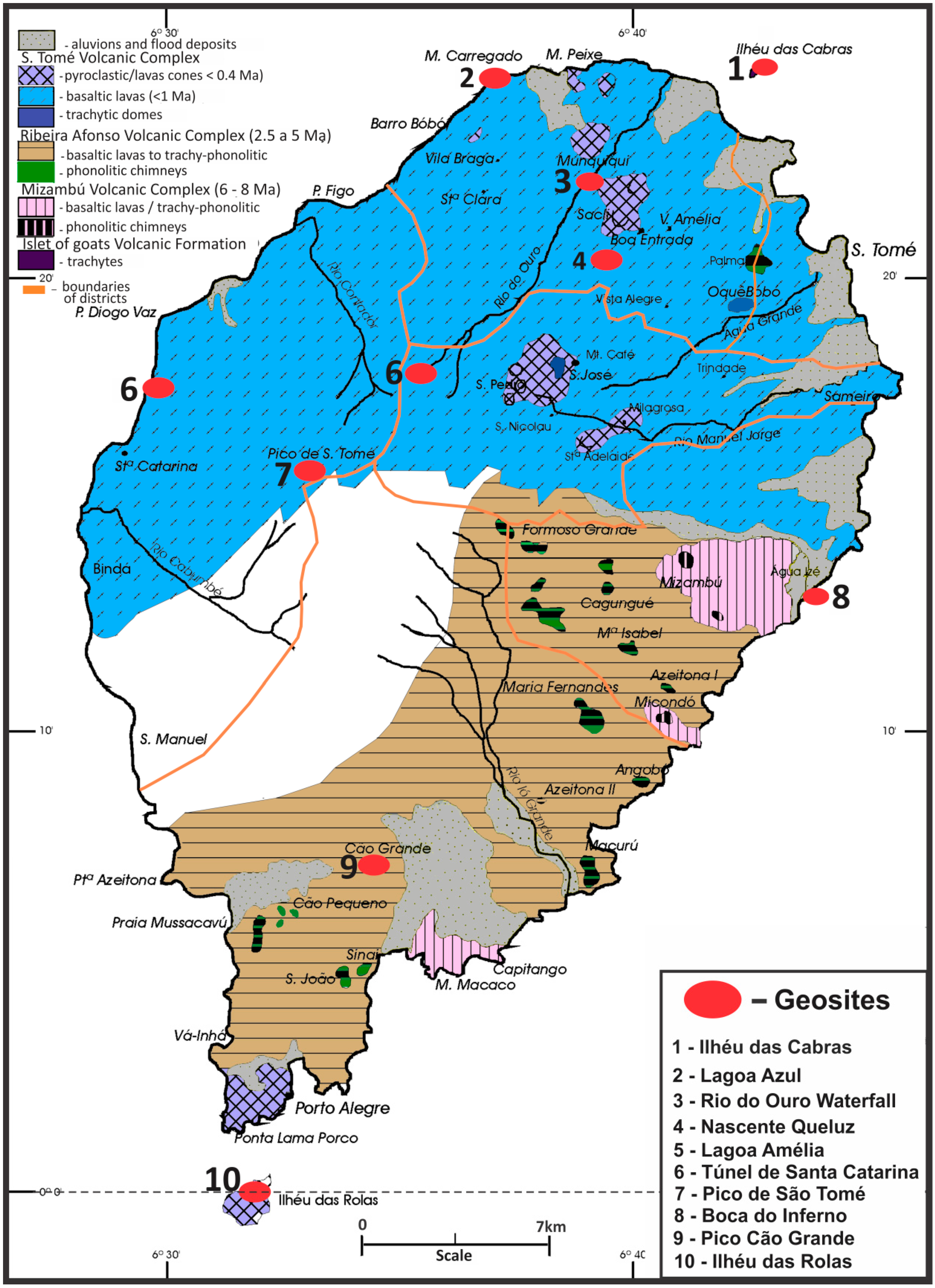 Africa is the continent with the deepest and richest geological, biological and cultural heritage [10], boasting the world’s geodiversity hotspot [32]. However, Africa has only 89 (9%) properties in the World Heritage List of UNESCO (48 cultural sites, 37 natural sites and four mixed sites) inscribed by 33 State Parties [45]. So far, the Democratic Republic of São Tomé and Principe is not included in such list, despite that the biodiversity of the isle of Príncipe has already been recognized by UNESCO through the Man and the Biosphere Programme [8]. The particular location of this small volcanic archipelago in the oceanic sector of the “Cameroon Volcanic Line" makes its outcrops subject of interest to the scientific community. The representativeness and uniqueness of some give them heritage value, as supported in this work, where 10 geosites of the São Tomé Island were selected, described and evaluated on the basis of the heritage values they display: Cascata do Rio do Ouro, Boca do Inferno, Pico de Cão Grande, Lagoa Azul, Nascente Queluz, Lagoa Amélia, Ilhéu das Rolas, Túnel de Santa Catarina, Ilhéu das Cabras, and Pico de São Tomé. When analyzed from a strictly academic perspective, they correspond to sites with volcanological and hydrological heritage, besides geomorphological, i.e., geomorphosites [13].