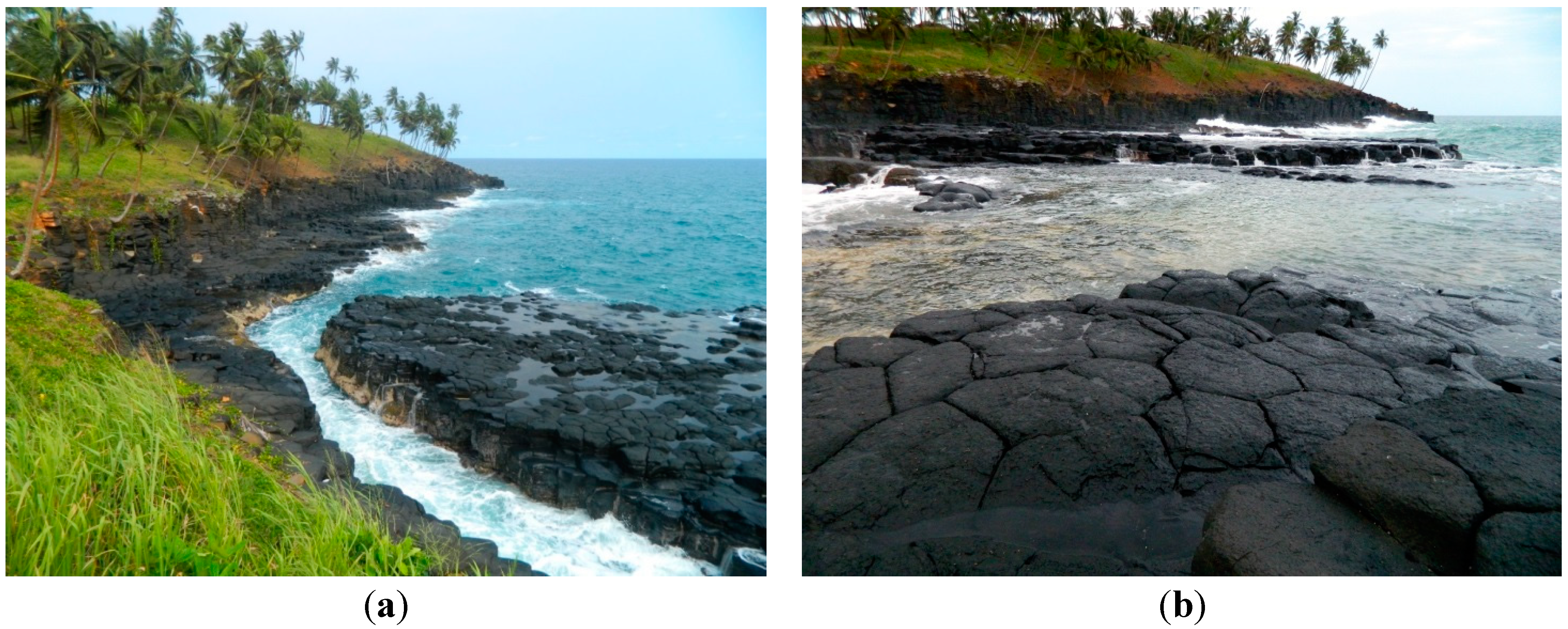 The Lagoa Azul (“blue lagoon”) geosite is a small beach located approximately 17 km north of the city of São Tomé (Lobata District; coordinates 0°24′23.10″N; 6°36′36.53″E), and is also frequently depicted on postcards due to its scenic value [24]. Its waters of intense turquoise color houses one of the most important coral reefs of the island (Figure 6a). On the north flank of the beach is the Morro Carregado, which comprises pyroclastic materials of the São Tomé Volcanic Complex, sometimes displaying rhythmic stratification (Figure 6b); it corresponds to the earliest volcanic phase of the Complex (<0.4 Ma) [17,18,20] and displays documental value [24].