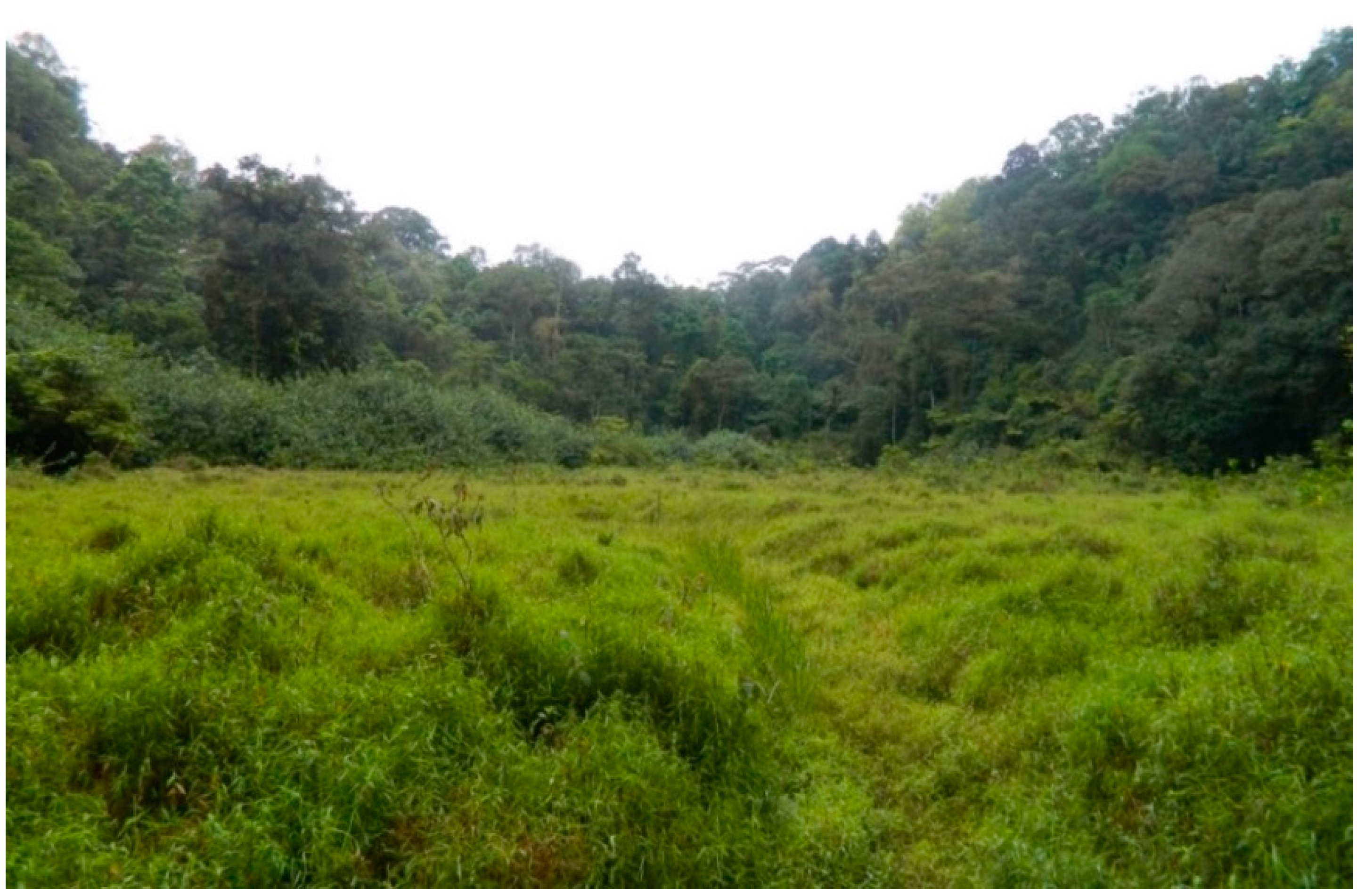 The Lagoa Amélia (“Amélia lagoon”) geosite is fundamentally a structural surface, little affected by erosion, representing an ancient volcanic crater completely covered with vegetation, and is a typical object displaying indicial value (Figure 8). The geosite is located in the Mé-Zochi District, approximately 1 h 30 min walk from the road, at Bom Sucesso (coordinates 0°16′52.78″N; 6°35′26.28″E; altitude 1428 m), in the Ôbo Natural Park. It corresponds to a phreatomagmatic crater whose activity is responsible for the well stratified and heterometric pyroclastic deposits containing abundant angular lithic fragments of basaltic and trachytic composition of the São Tomé Volcanic Complex [20]. As so, documental value can also be assigned to this geosite.