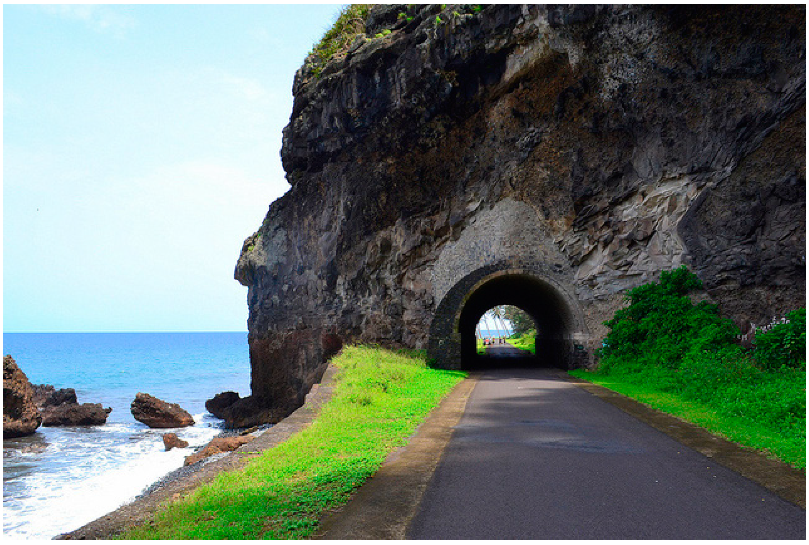 The Túnel de Santa Catarina (“Santa Catarina tunnel”) is located at the west coast of the island (coordinates 0°18′32.46″N; 6°29′22.93″E; Lembá District) drilling an outcrop that extends to the beach, which is the only anthropogenic structure of this kind in the country (Figure 10). The outcrop shows lahar deposits intercalated in the basaltic lavas, which indicate discontinuities in the volcanic activity responsible for the formation of the São Tomé Volcanic Complex [20]. Iconographic content can be assigned to this geosite, considering that the lahar deposits, as a resulting structure of a particular geological phenomenon (volcanic mudflow), show clear physical relation between the event and its effects [24].