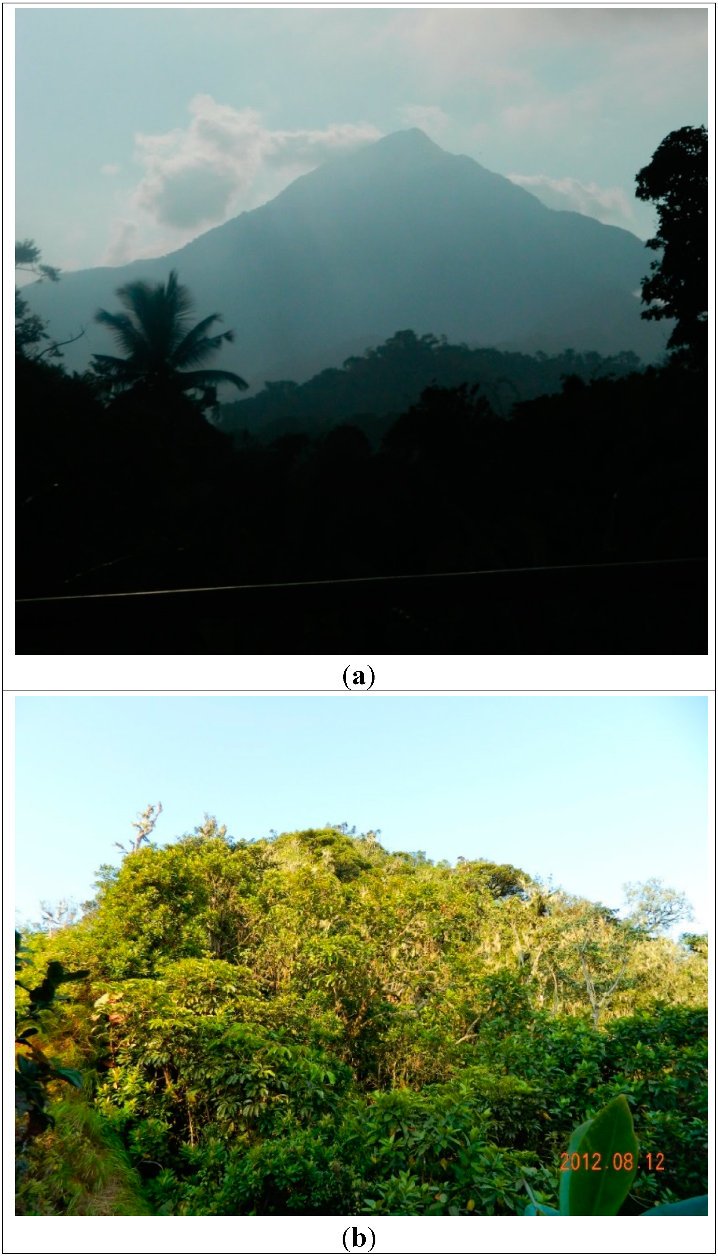 (a) The Pico de São Tomé observed from the bridge of Rio Lembá; (b) The top of Pico de São Tomé observed from the peak table.
