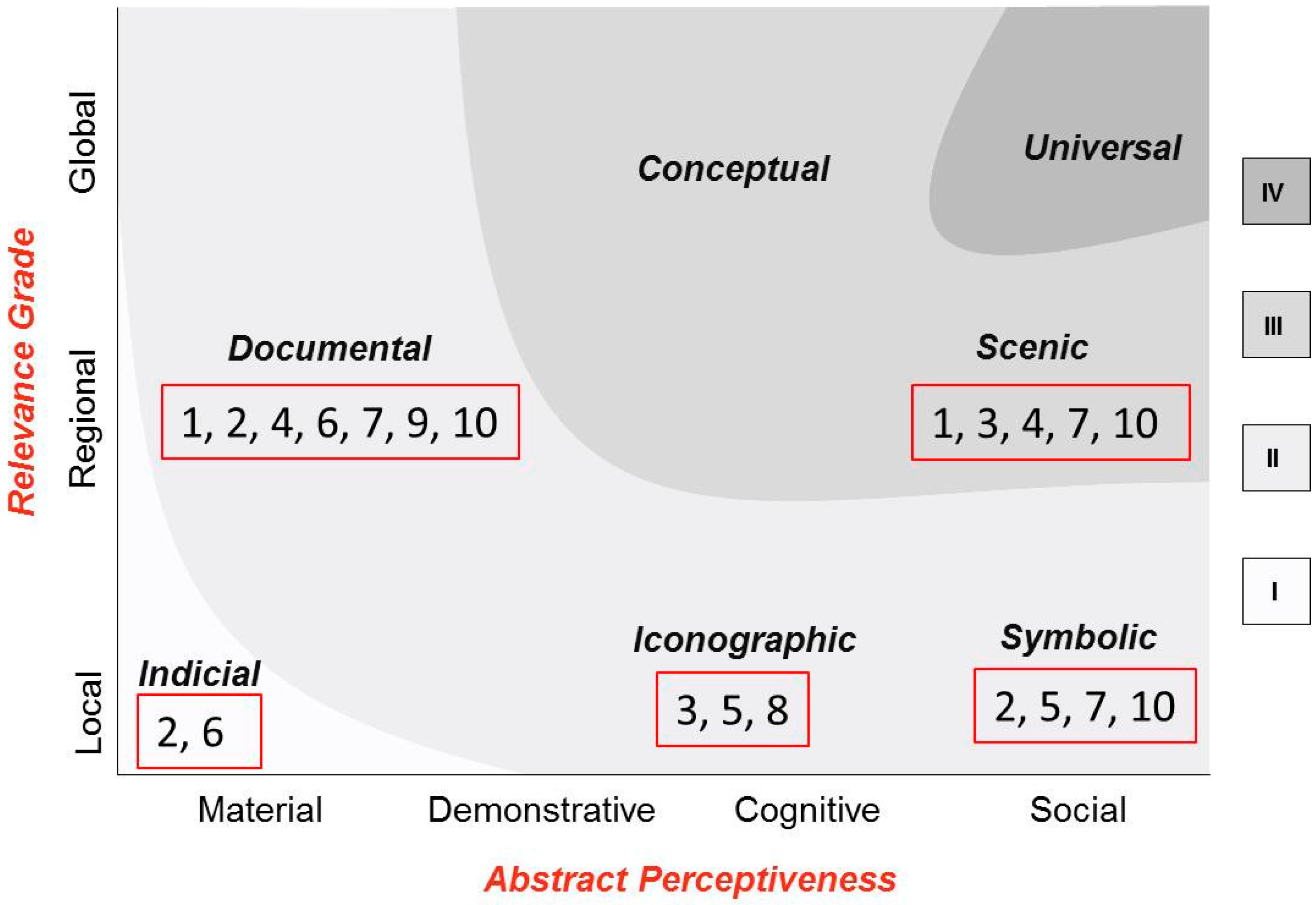 A qualitative system of classification of the geological heritage based on its content has been already proposed and reasoned in detail [24]. The content of a geological object with heritage value can be described through a set of concepts controlled by variable factors which depend both on the meaning attributed to the objects by scientific communities (defined as “relevance grade” and ranging from local to global) and the public understanding of such meanings related to its social use (defined as “abstract perceptiveness”, which ranges from individual to social scale).