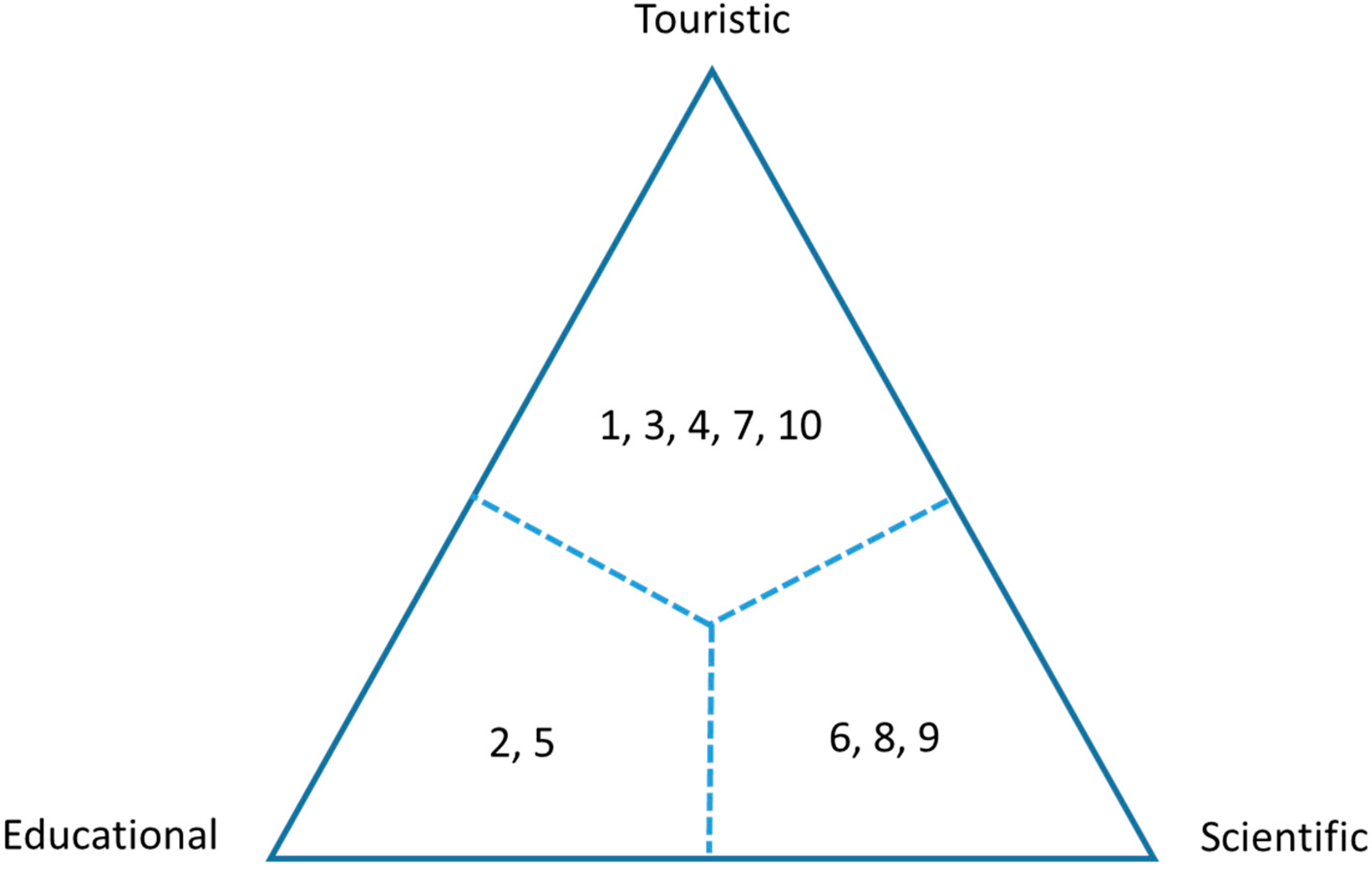 Many geosites of São Tomé Island display heritage contents which can meet different tourist expectations. The non-specialized public (1, 3, 4, 7 and 10), as well as geotourists with a strong scientific background (6, 8 and 9), can enrich their travelling experience to the island by visiting the appropriate geosites; as so, the inclusion of each geosite in geo-itineraries should take into account their main potential use (Figure 14).