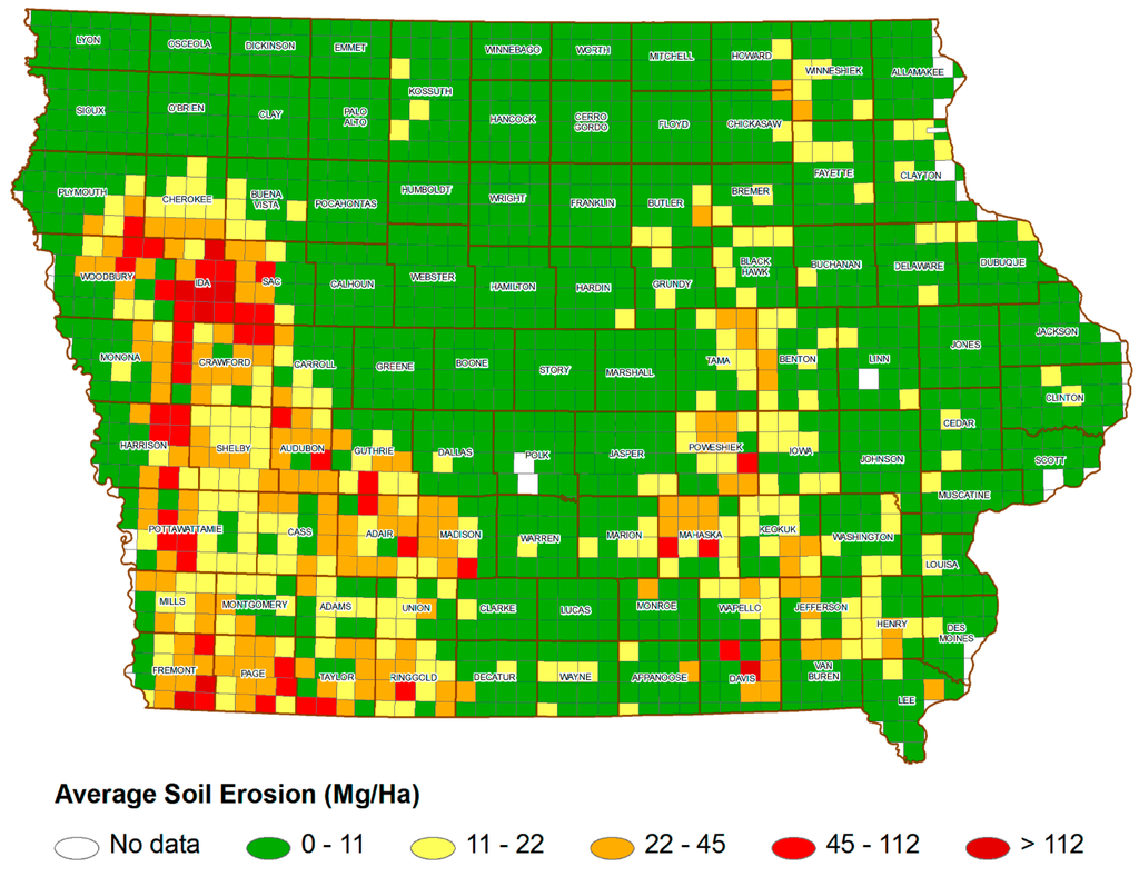Average estimated sheet and rill soil erosion rates for each township in Iowa for 2007 [12].