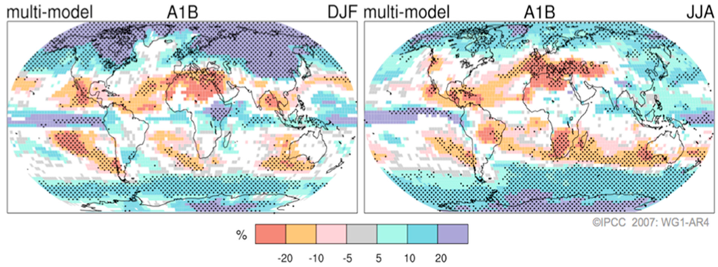 Projected patterns of precipitation change across the globe for the 21st century. Left side projects for the months of December, January and February. Right side projects changes for the months of June, July, and August [62].