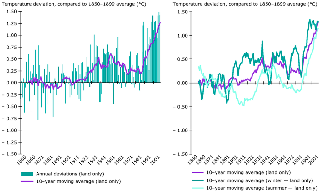 For the period 1850–2009, observed annual temperature (C°) deviations from the 1850–1899 average, and 10-year average for the same period over the European land surface (left). For the period 1850–2009, observed 10-year average temperature (C°) deviations from the 1850–1899 average for the European land surface (right) [63].