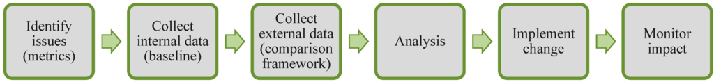 Fundamentally, a “benchmark” is a reference or measurement standard used for comparison. “Benchmarking” is the continuous activity of identifying, understanding and developing better practices and processes that will lead to higher performance [7]. It is the process of comparing one’s business processes and performance metrics to industry’s best practices. In Figure 1a typical benchmarking process is presented.