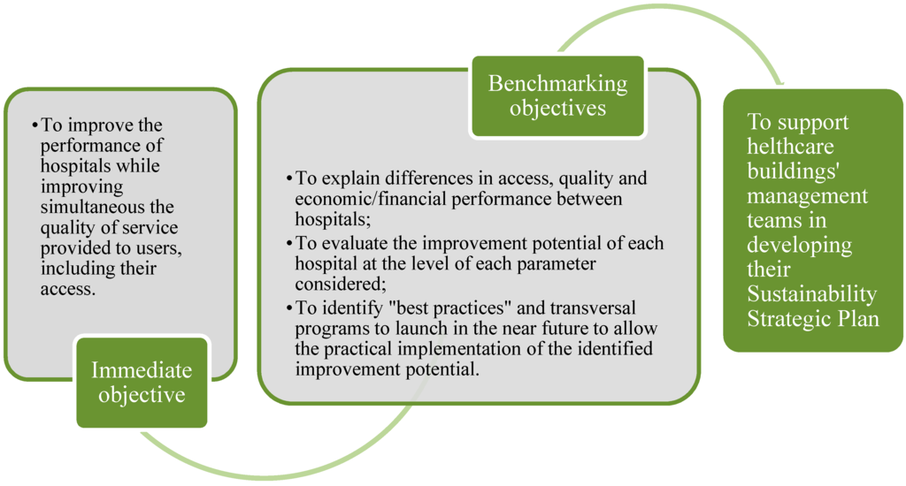 In order to guide and support the development of strategic plans for healthcare buildings, it is fundamental that benchmarks for comparison between institutions can be established. This is important because it allows for identifying: the causes of the differences between hospitals at the resources consumption, accessibility, quality, economic, and financial performance levels; the potential for improvement of each hospital at the level of each assessed performance category or sustainability parameter; the best and conventional building use practices (e.g., best operational energy efficiency practices); and the transversal different programs (including healthcare activities themselves) to be launched for the practical implementation of the identified improvement potential. Thus, the benchmarking process in the field of healthcare buildings, aims at improving both the environmental and societal quality of hospitals, while enhancing their economic and financial performances.