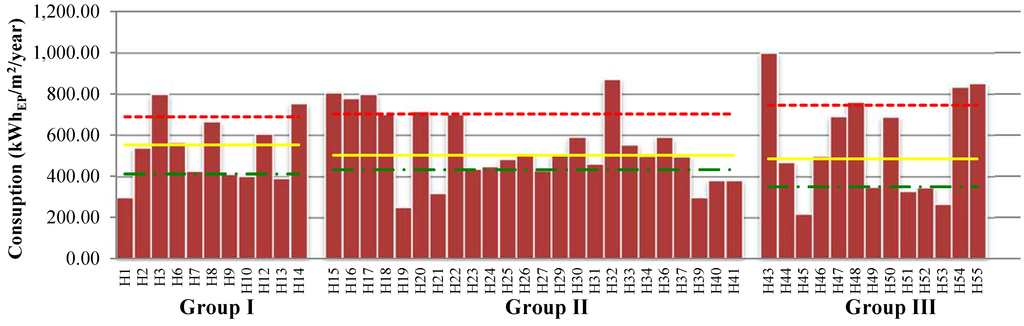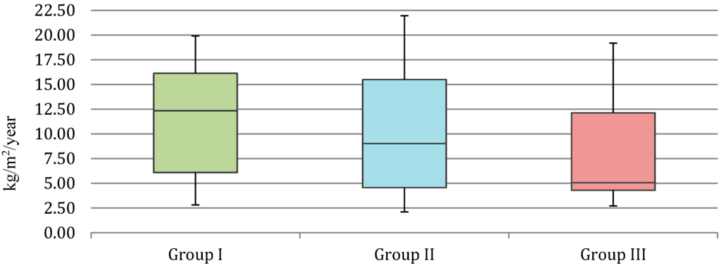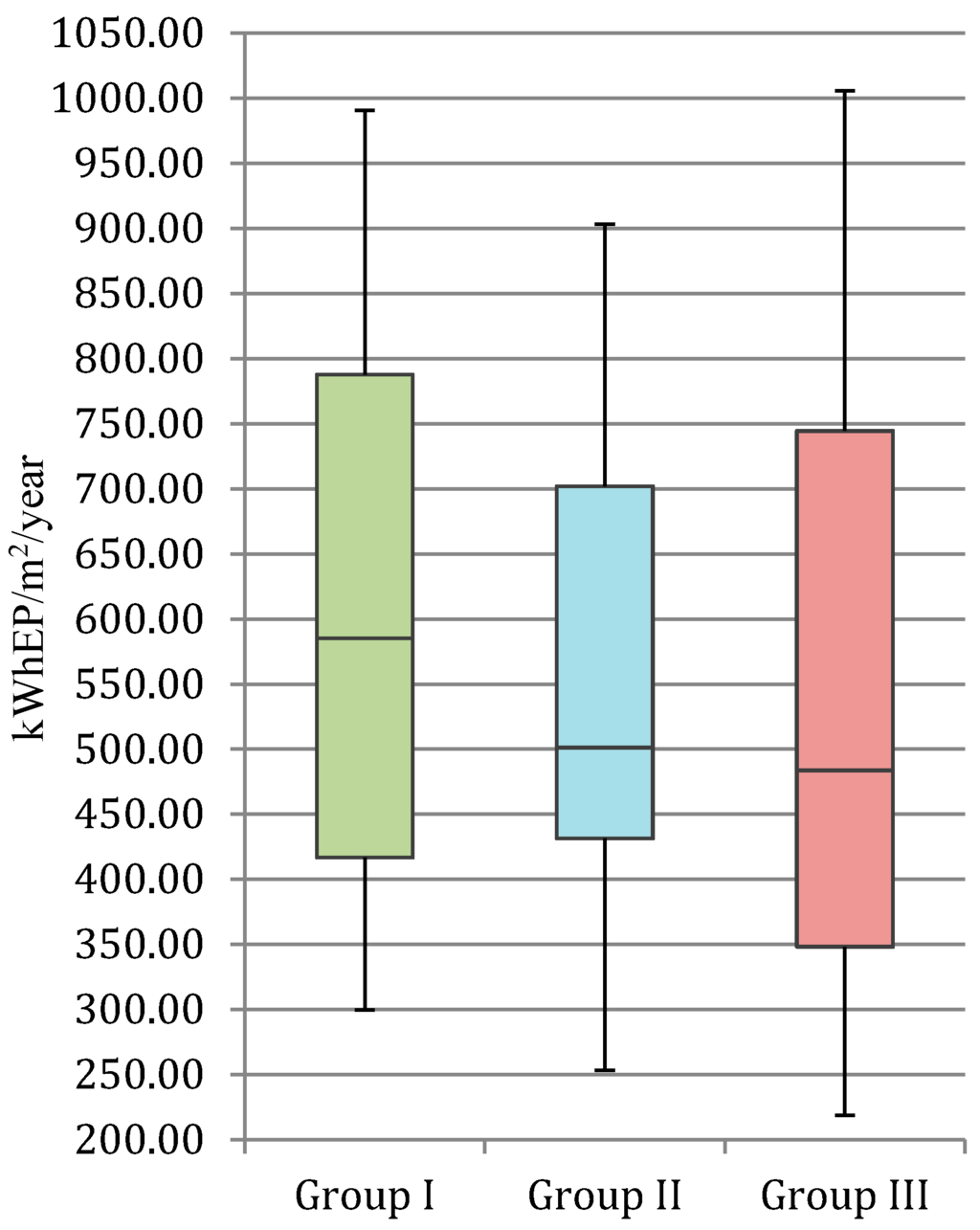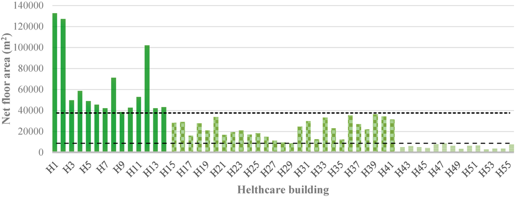 - Group I—healthcare buildings with net floor area higher than 37,663.00 m2 (3rd quartile);