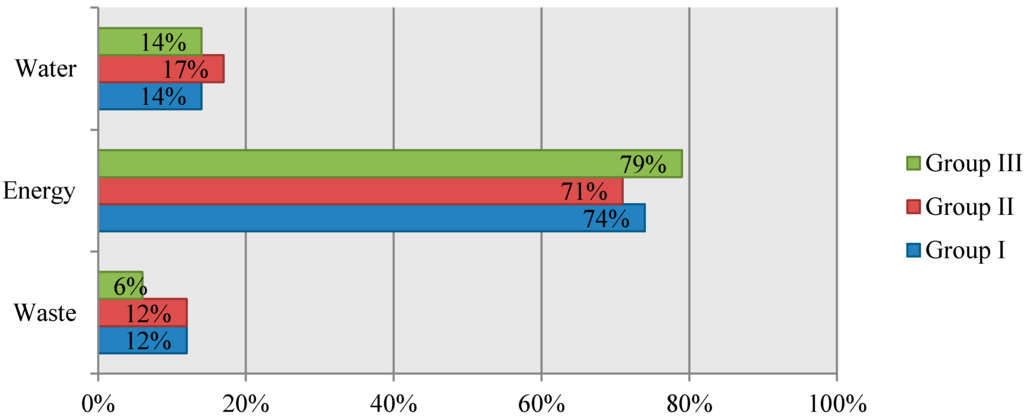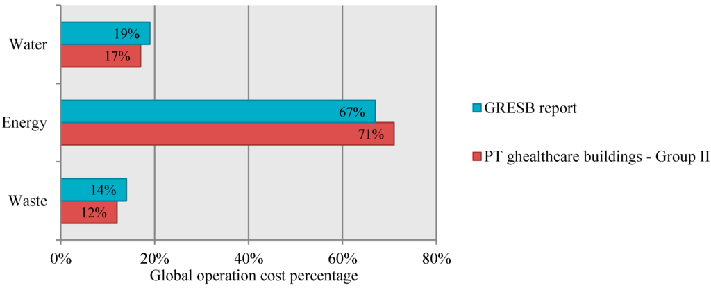 The first comparison is made with the results reported by Global Real Estate Sustainability Benchmark (GRESB) in 2013 report (based in figures from year 2012). This study is based in a sample of 119 non-residential buildings from North and South America, Europe, Asia and Oceania. 3.6% of that sample are healthcare buildings [37]. By analyzing the operational costs (cost related to water consumption, energy consumption, and waste production) obtained in the study presented in this paper, it is possible to verify that the flow with the highest influence on the total costs (energy), is the same presented in GRESB report, according to healthcare buildings covered by it (Figure 15). Additionally, the weight of each flow on the total costs is distributed in a similar way in both studies, which allows one to conclude that the distribution of costs in Portuguese healthcare buildings is equivalent to the ones presented in the GRESB report (Figure 15).