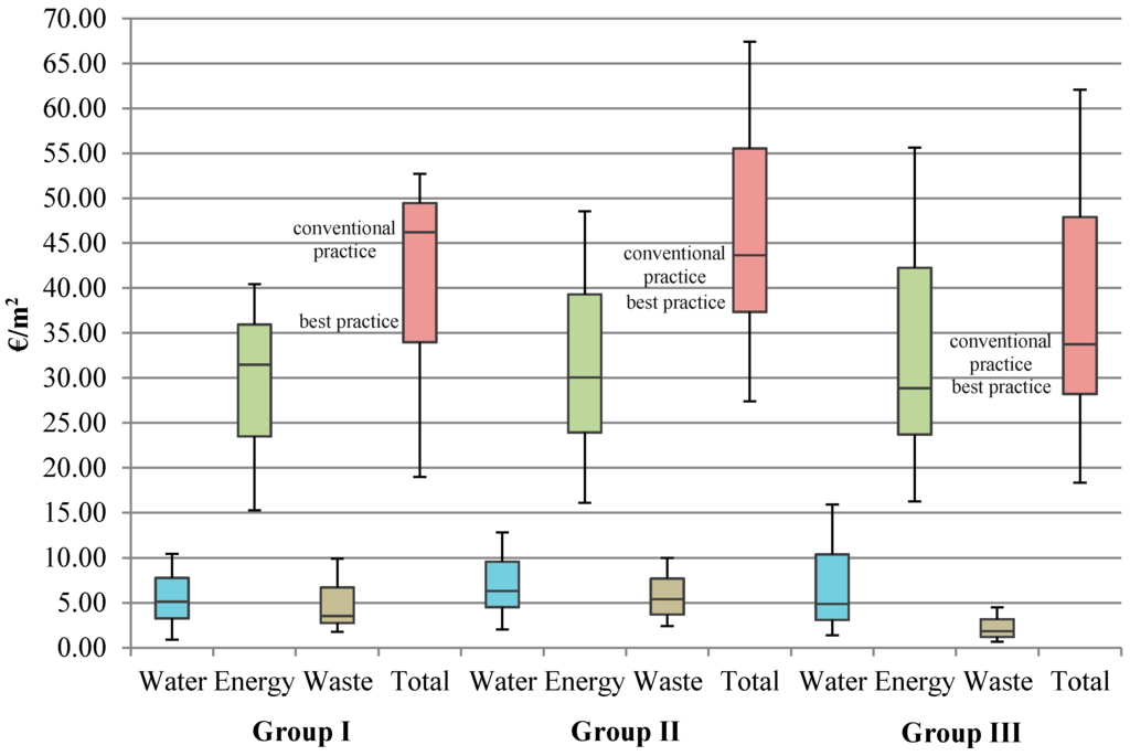 The analysis of operation costs, resources consumption, and waste production is very important in the field of Healthcare Building Sustainability Assessment (HBSA) methods [23], because it allows for the definition of the best practices for each of these important indicators of sustainable development.