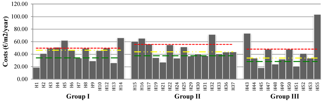 Influence of resource consumption costs in each group of healthcare buildings (costs per m2).