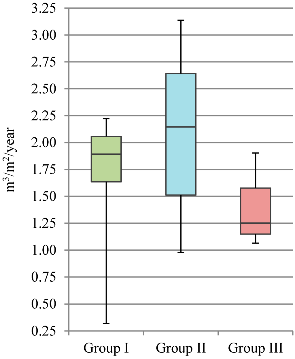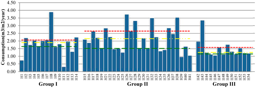 For example, based on the results presented in Table 3 and for a hospital belonging to Group I that has an annual water consumption of 1.80 m3/m2/year, the normalization of the water demand of this healthcare building is done according to the process presented in Table 5 and Equation (3).